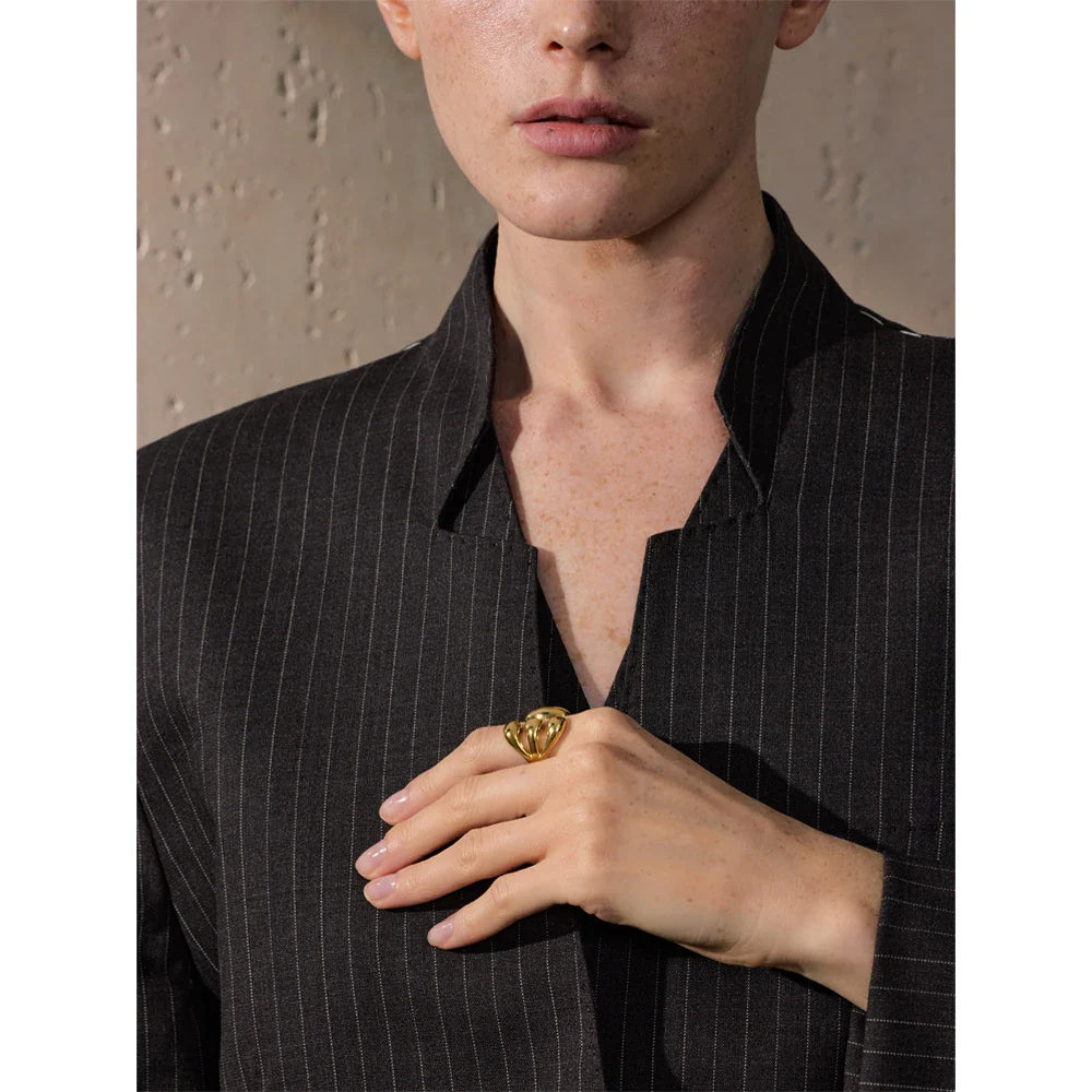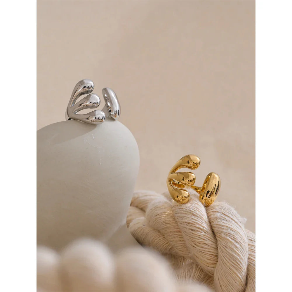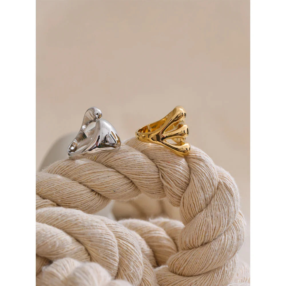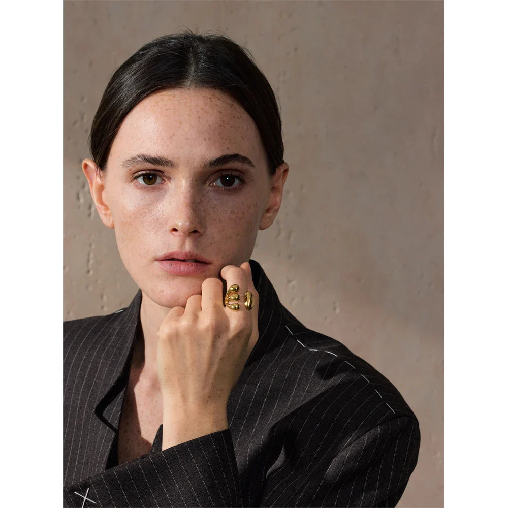 The Calypso Cuff Ring from Huna Jewelry is a modern statement piece that blends bold design with timeless elegance. Featuring a sleek open-band structure, this adjustable ring is crafted from high-quality stainless steel with 18K PVD gold plating, ensuring a luxurious shine and long-lasting durability. Its minimalist yet eye-catching geometric design makes it the perfect accessory for everyday wear or special occasions. Whether worn alone or stacked with other rings, it effortlessly elevates any look with a touch of contemporary sophistication.