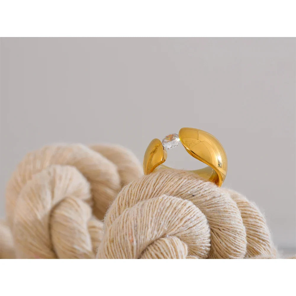 Discover modern elegance with the Elvira Wide Ring from Huna Jewelry. This sleek and sophisticated piece features a smooth, wide band with a subtle cuff-inspired design, seamlessly connected by a brilliant mini cubic zirconia stone at the center. Crafted from high-quality stainless steel and 18K PVD gold plating, this ring is waterproof, tarnish-resistant, and designed for lasting wear. Whether worn alone or stacked with other rings, this versatile statement piece adds a touch of refined beauty to any outfit.