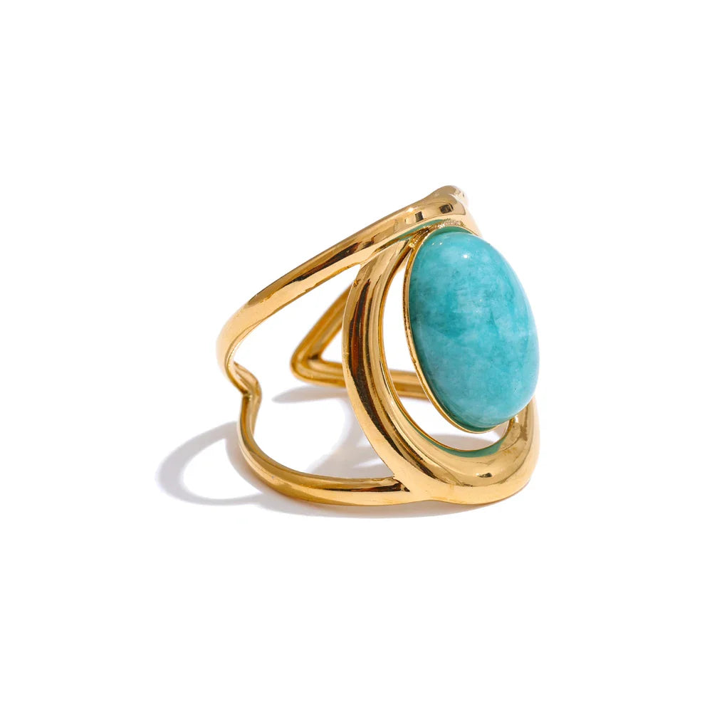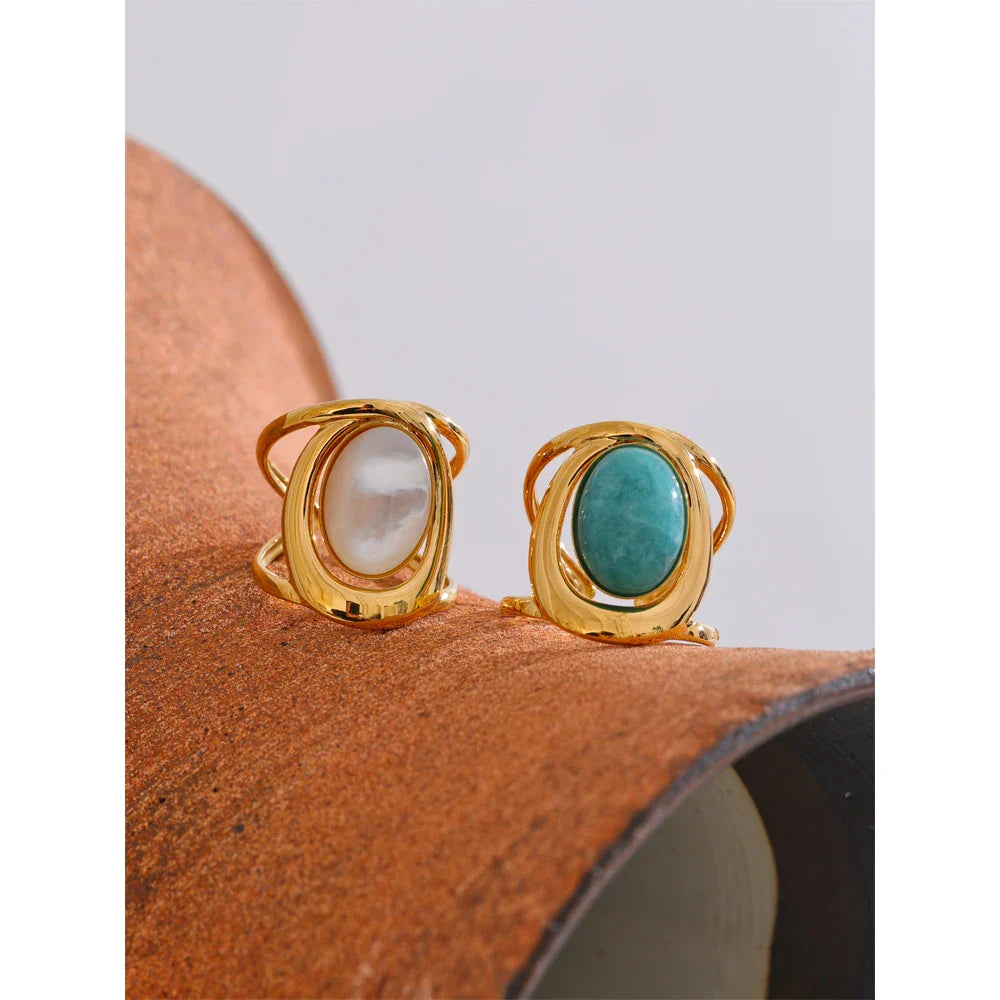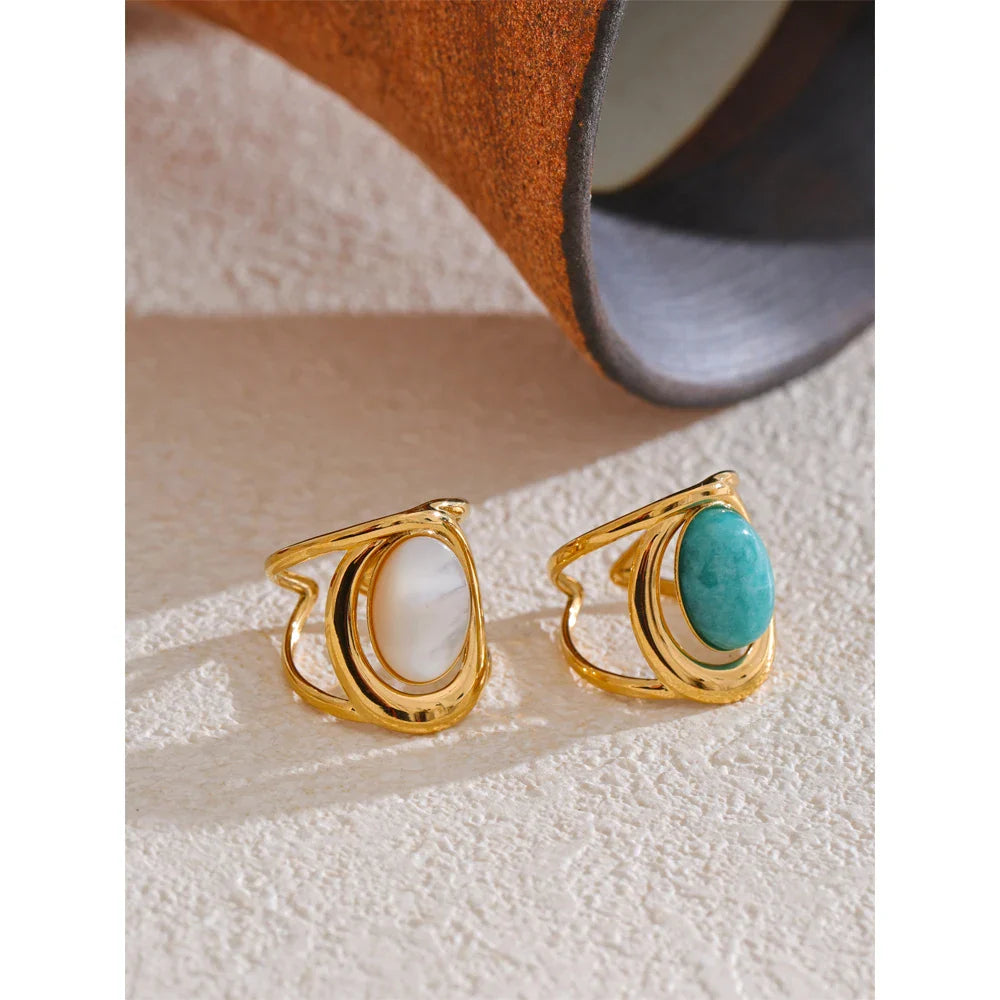 The Leora Oval Natural Stone Ring from Huna Jewelry is a perfect blend of elegance and modern design. This open cuff ring features a wide yet hollow band, giving it a lightweight feel while maintaining a bold statement look. The oval-shaped natural stone centerpiece is beautifully inlaid, adding a touch of sophistication and timeless charm. Crafted from premium stainless steel with 18K PVD gold plating, this ring is durable, waterproof, and tarnish-resistant, making it an ideal piece for daily wear or special occasions.