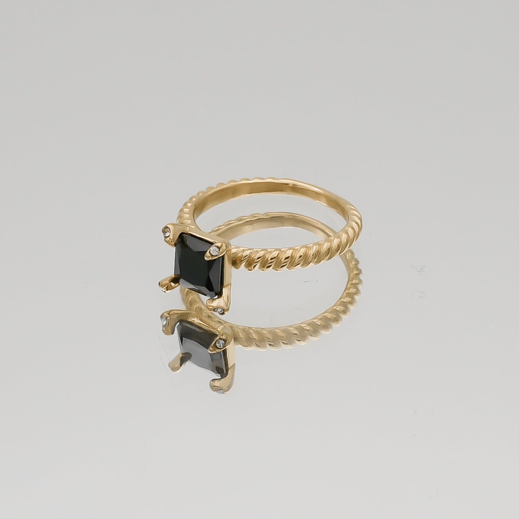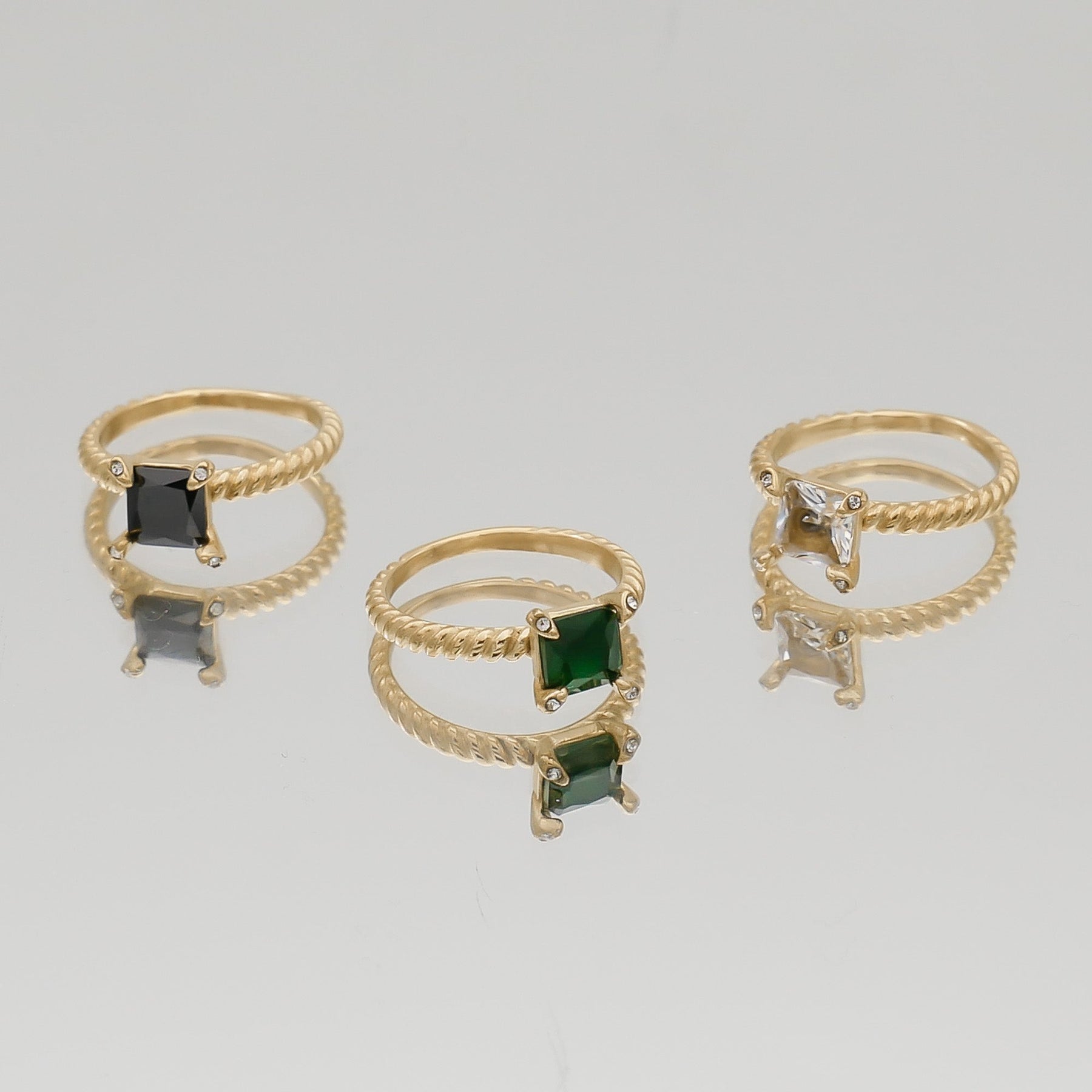 The Huna Jewelry Mia Gemstone Ring is a dainty, timeless piece featuring a stunning square gemstone in emerald, onyx, or clear cubic zirconia. The 18K gold-plated stainless steel band has an elegant twisted design, offering a blend of durability and sophistication. Ideal for stacking or as a stand-alone statement, this ring is tarnish-resistant and water-resistant, ensuring lasting brilliance. Available in small, medium, and large sizes for the perfect fit.