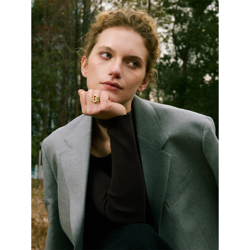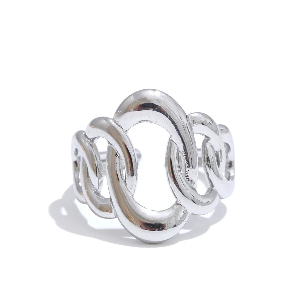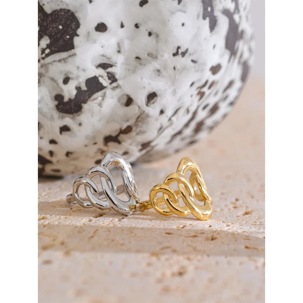 The Nola Hollow Ring from Huna Jewelry is a bold yet elegant statement piece designed for modern minimalists. Featuring a unique openwork design with five interwoven hollow ovals, this ring creates a delicate yet striking look. Crafted from premium stainless steel with 18K PVD gold plating, it offers durability, shine, and a lightweight feel for all-day comfort. Whether you're dressing up for an event or adding a touch of sophistication to your everyday look, this versatile and chic ring is the perfect choice.