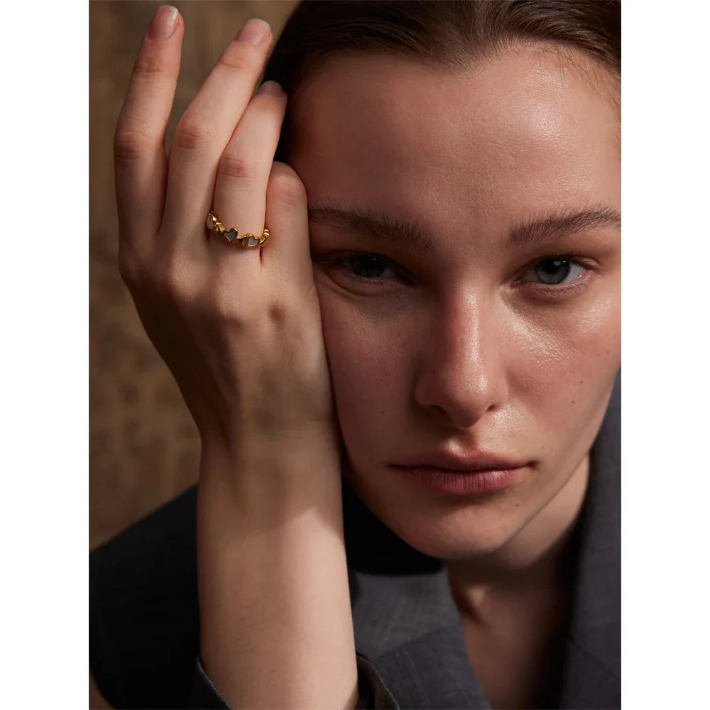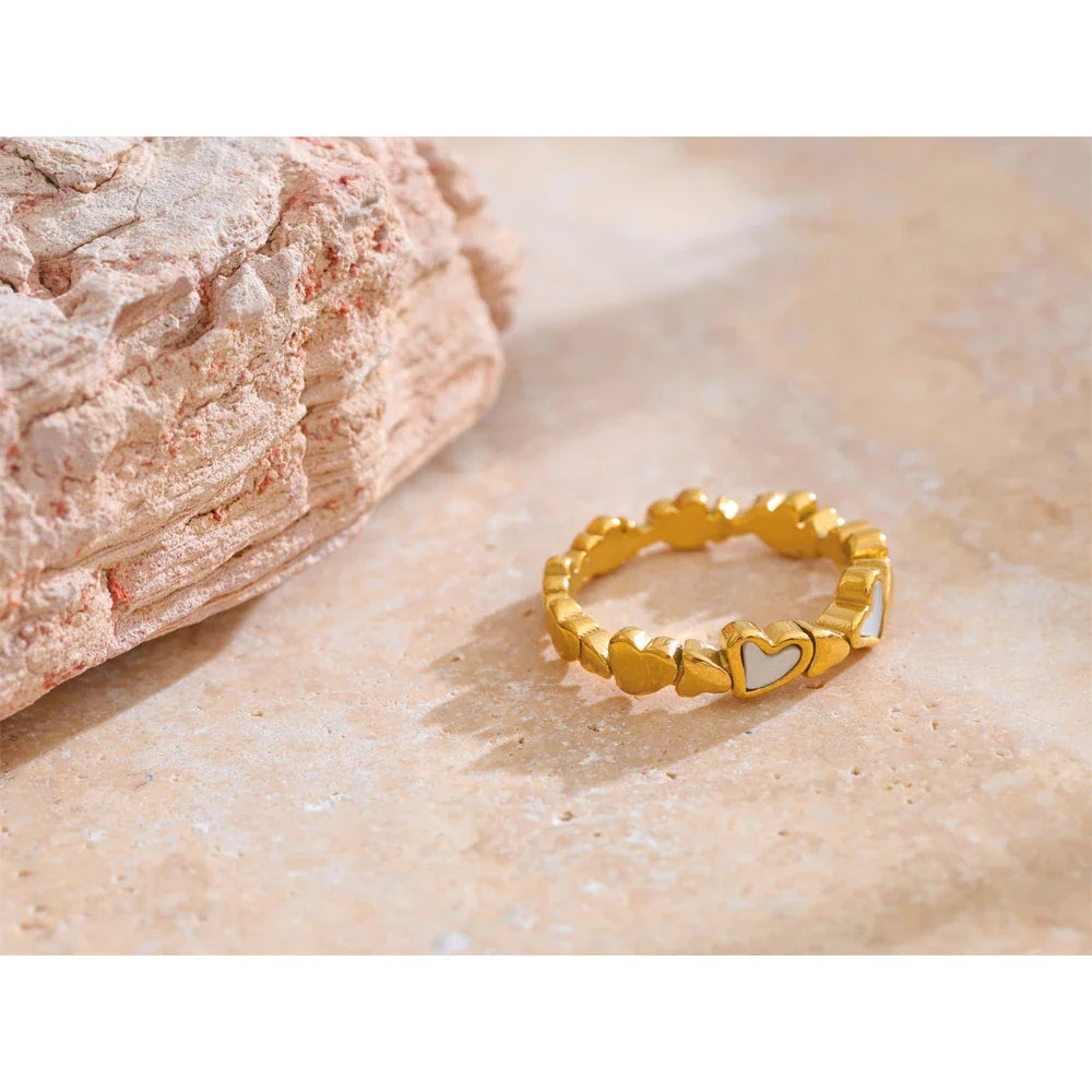 The Raina Natural Shell Gold Heart Ring from Huna Jewelry is the perfect blend of romance and elegance. Featuring a delicate band of alternating solid gold hearts and natural shell-inlaid hearts, this ring is dainty, feminine, and timeless. Made from premium 18K PVD gold-plated stainless steel, it is waterproof, tarnish-resistant, and designed for everyday wear. Whether worn alone for a minimalist touch or stacked for a trendy layered look, this ring is a must-have accessory for any jewelry lover.