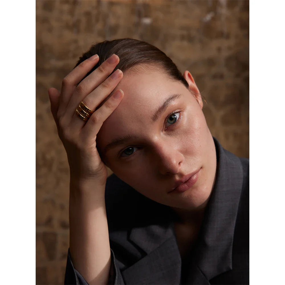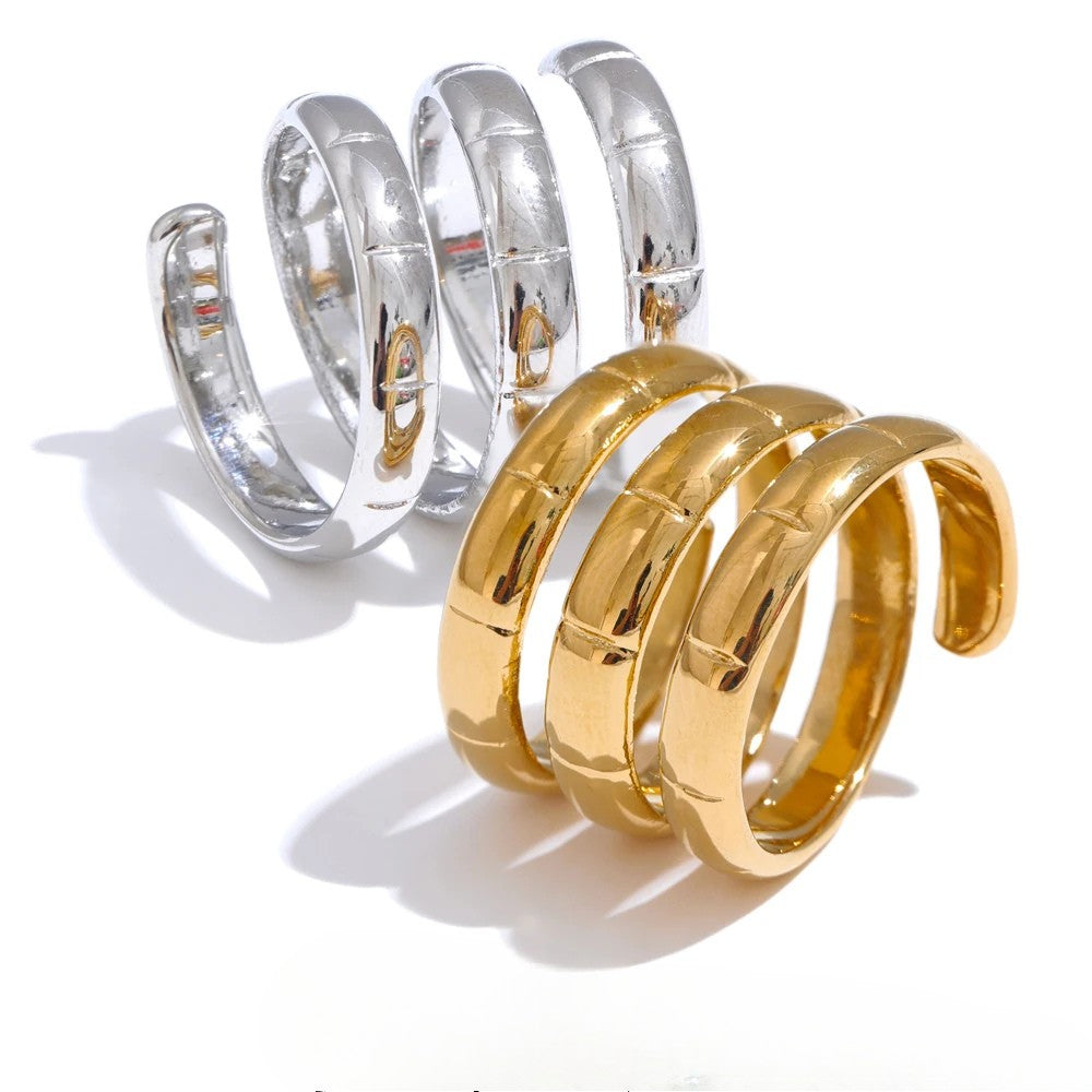 Make a bold statement with the Valentina Swirling Ring from Huna Jewelry, a unique and stylish accessory that exudes modern elegance. This eye-catching ring features a swirling, layered design, creating the illusion of multiple stacked bands while remaining a single, seamless piece. Crafted from high-quality, waterproof 18K real gold-plated stainless steel, this durable and sophisticated ring is perfect for any occasion, from casual outings to formal events.