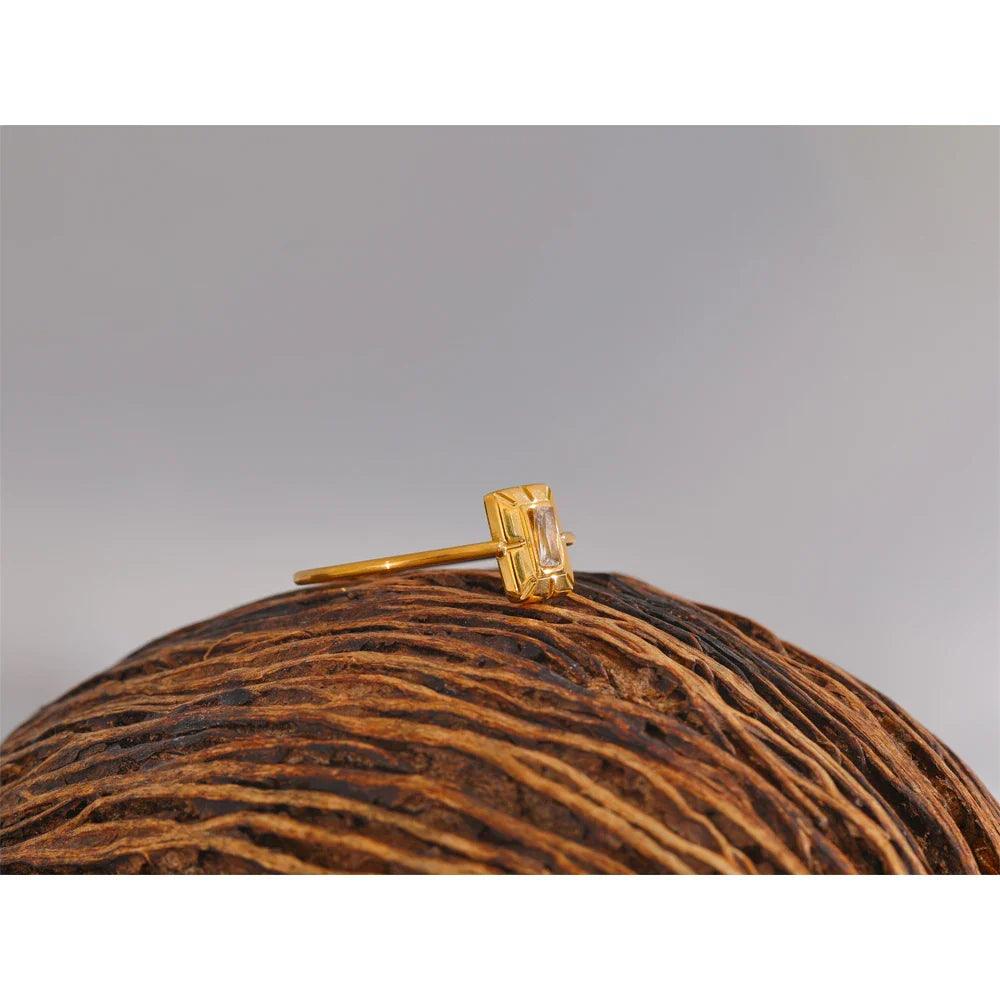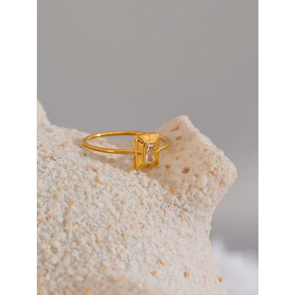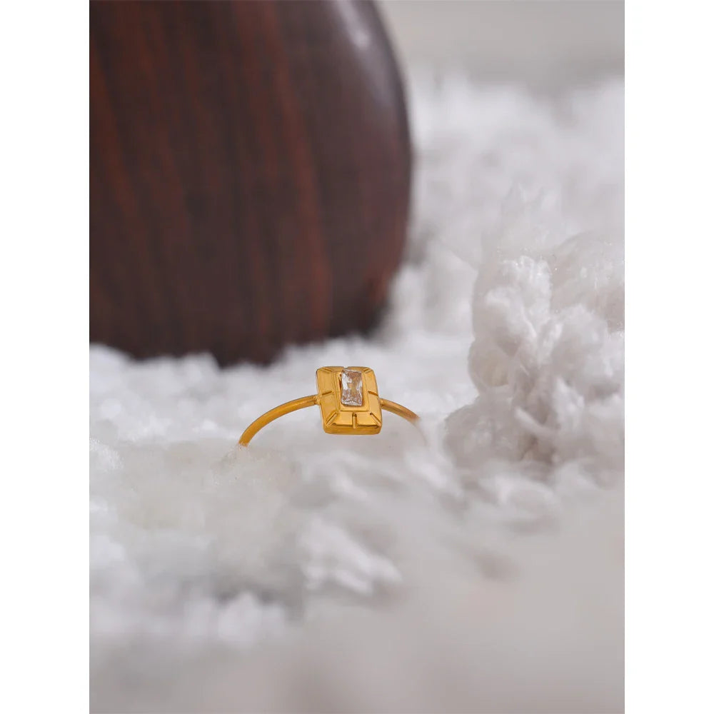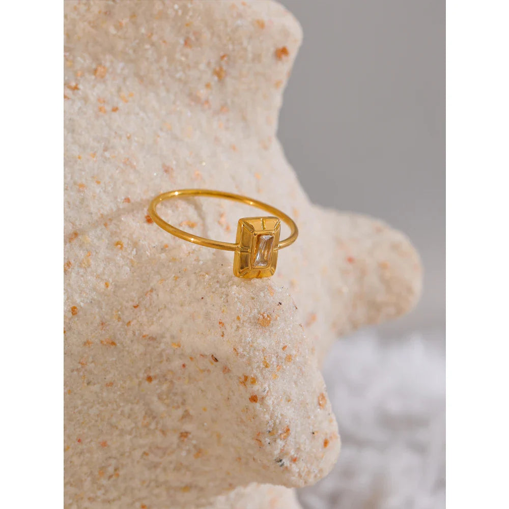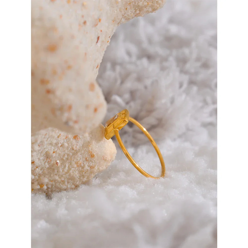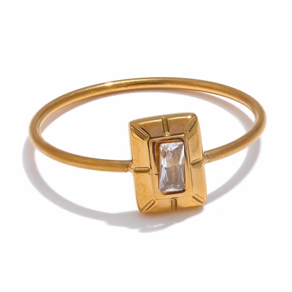 Enhance your jewelry collection with the Wilhelmina Delicate Ring from Huna Jewelry—a modern yet timeless piece designed for those who love understated elegance. Featuring a sleek, thin band and a bold geometric centerpiece adorned with a thin rectangular cubic zirconia, this ring exudes sophistication and refinement. Made from high-quality stainless steel with 18K PVD gold plating, it is durable, waterproof, and resistant to tarnishing, making it perfect for daily wear or special occasions.