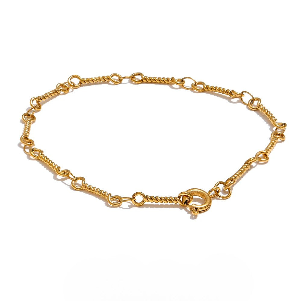 The Irina Twisted Bracelet from Huna Jewelry features a series of delicately twisted, thin metal links connected to form a sleek chain. Crafted in stainless steel with high-shine gold plating, this water-resistant piece brings texture and movement to any look. Wear it solo for a clean finish or layer it for a more dimensional stack.