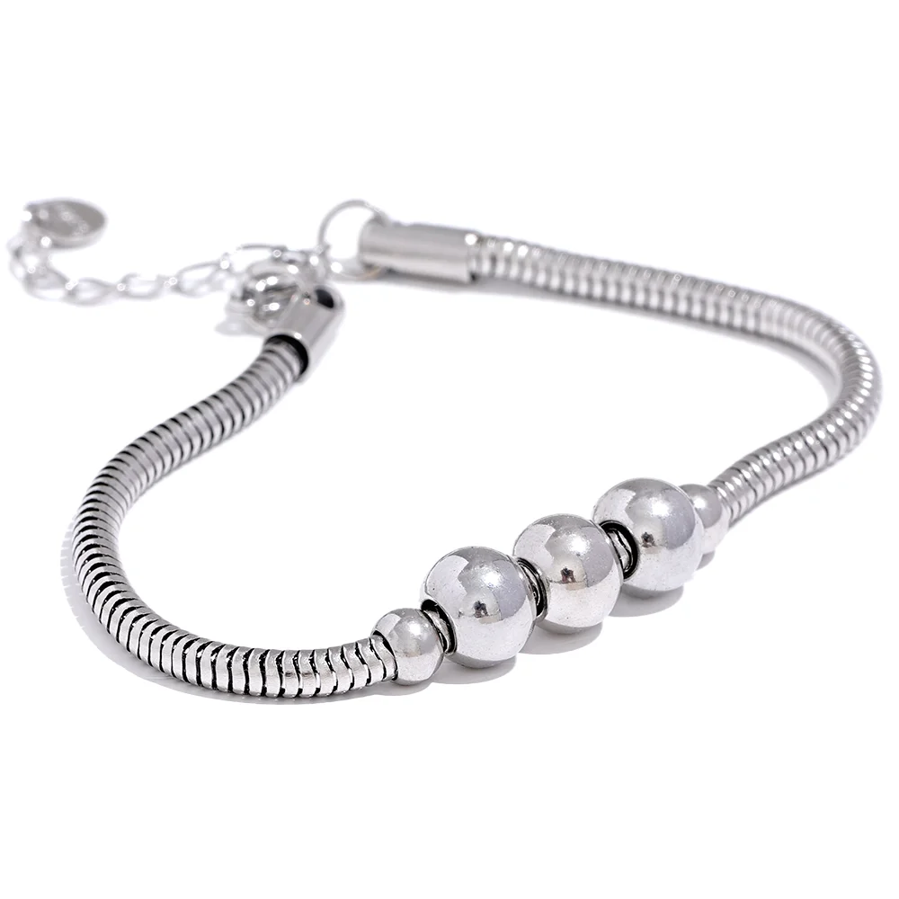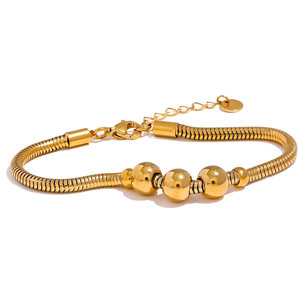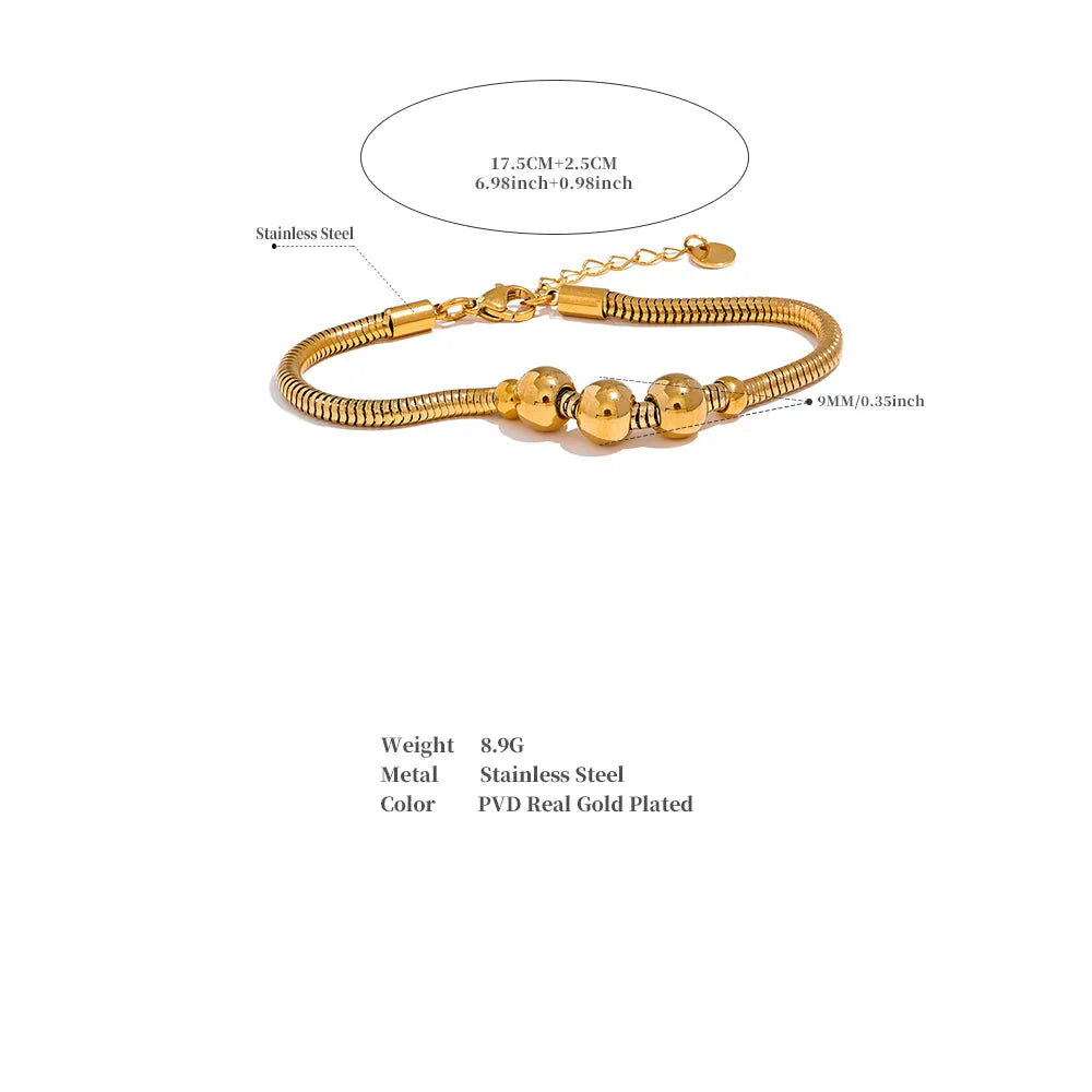The Zelda Beaded Chain Bracelet from Huna Jewelry features a clean, modern design with a subtle decorative twist. Its smooth chain is highlighted by three larger gold beads, framed by two smaller ones—creating a balanced and refined detail. Easy to wear and waterproof, it’s the perfect go-to bracelet for everyday styling.