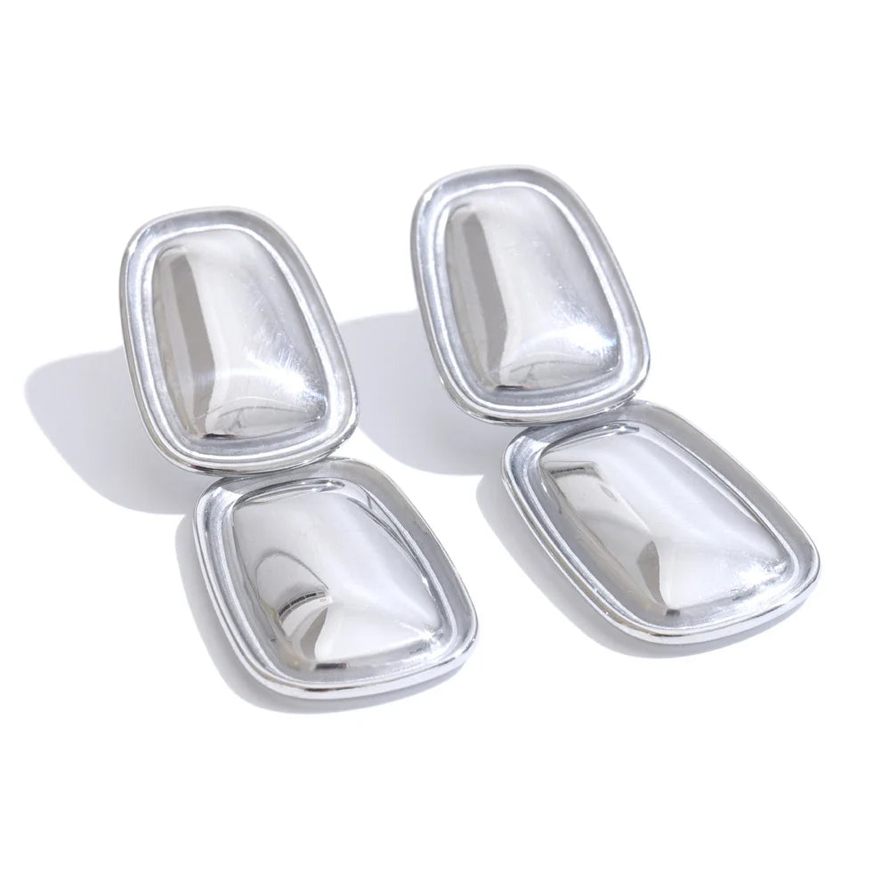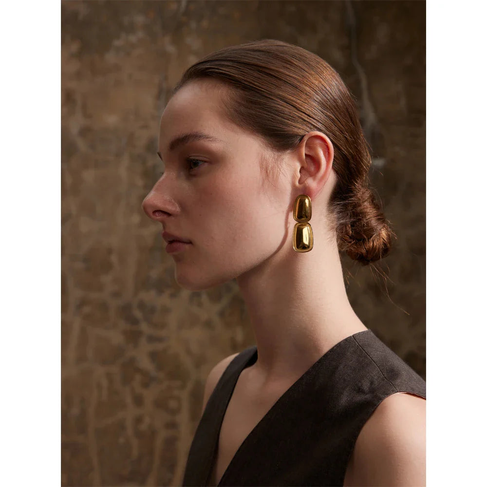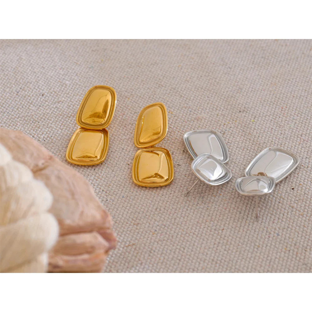 Elevate your everyday style with the Autumn Rectangle Drop Earrings from Huna Jewelry. Featuring a sleek geometric design, these earrings showcase two interconnected rectangular shapes that create a modern and sophisticated statement. Crafted from high-quality stainless steel with 18K PVD gold or platinum plating, they are water resistant, hypoallergenic, and designed for long-lasting wear. Whether you're dressing up for an event or adding a chic touch to your casual outfit, these earrings are the perfect accessory.
