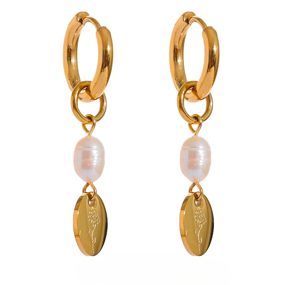 • Design: Hoop base with natural pearl and engraved floral disc drop