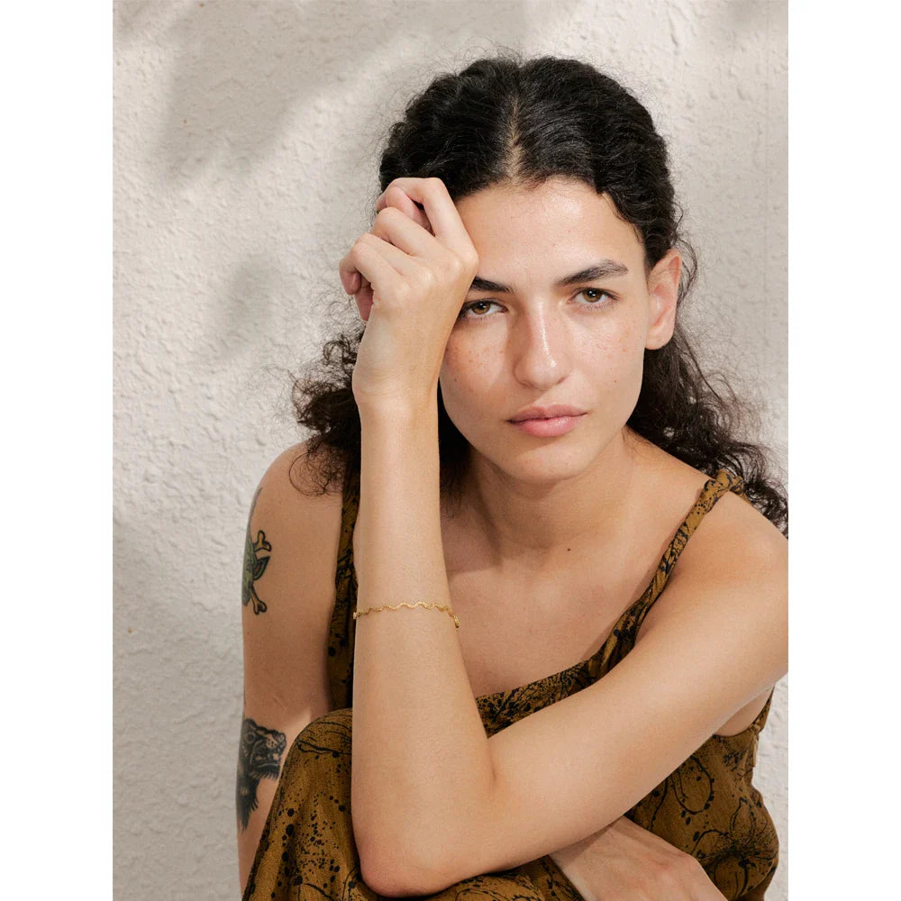 The Nova Wavy Bracelet from Huna Jewelry features a refined wavy structure that brings movement and shine to your wrist. Designed with a slim, textured finish, this bracelet pairs effortlessly with both casual and polished outfits. Its minimal yet eye-catching form makes it an easy layering piece or a standalone detail.