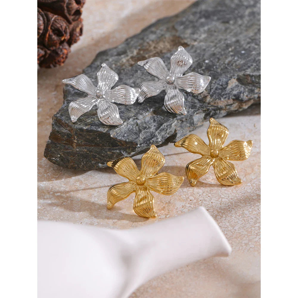 • Design: Large, statement flower-shaped stud earrings with a sleek finish