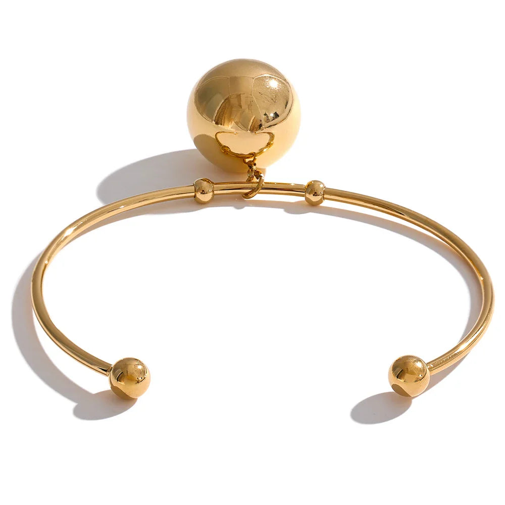 • Design: Thin open cuff with a large dangling ball charm at the center