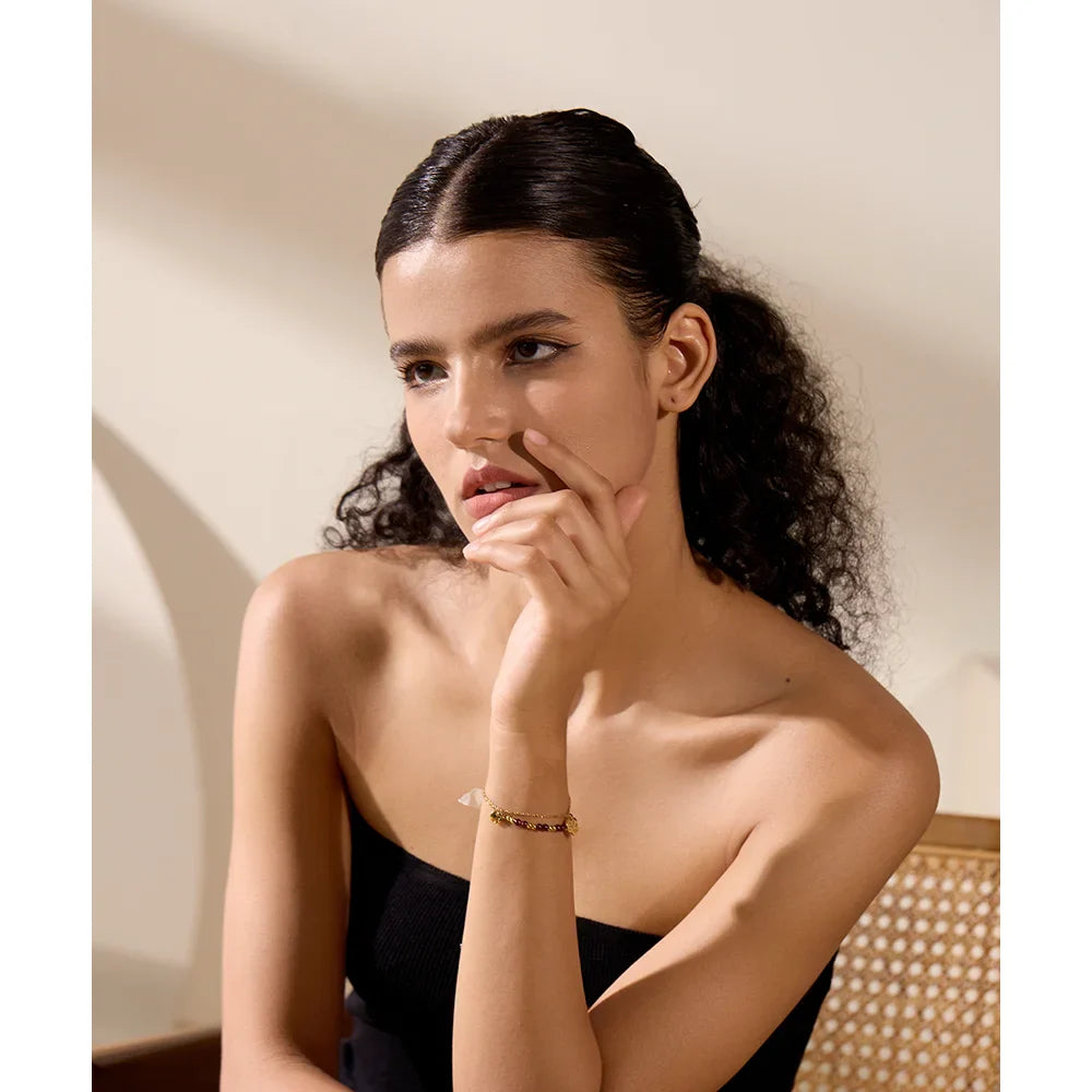 Add a touch of elegance to your jewelry collection with the Ophelia Layered Beaded Bracelet from Huna Jewelry. Featuring a dual-layer design, this bracelet combines a delicate beaded chain with a sleek gold chain, accented by dangling flat round charms for a chic and stylish finish. Crafted from high-quality stainless steel with PVD real gold plating, this piece is waterproof, tarnish-resistant, and perfect for everyday wear. Whether worn alone or stacked, it adds a sophisticated touch to any outfit.