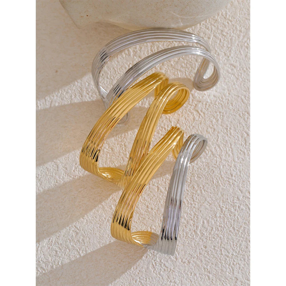 Clean lines and bold geometry come together in the Xandra Cuff Bracelet from Huna Jewelry. With a modern hollowed shape and subtle line texture, this gold-tone bangle creates visual depth while staying true to a minimalist aesthetic. Its open form adds an airy look, ideal for stacking or wearing solo as a refined statement.