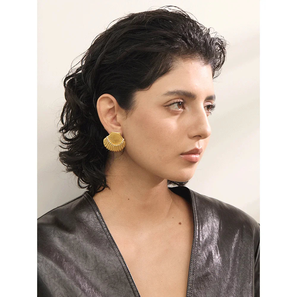 The Delaney Shell Stud Earrings from Huna Jewelry bring a bold yet polished feel to any outfit. Designed in a large shell shape with a textured surface, these earrings feature a sleek line of mini zirconia stones for extra shine. An elegant finishing touch for day or evening wear.