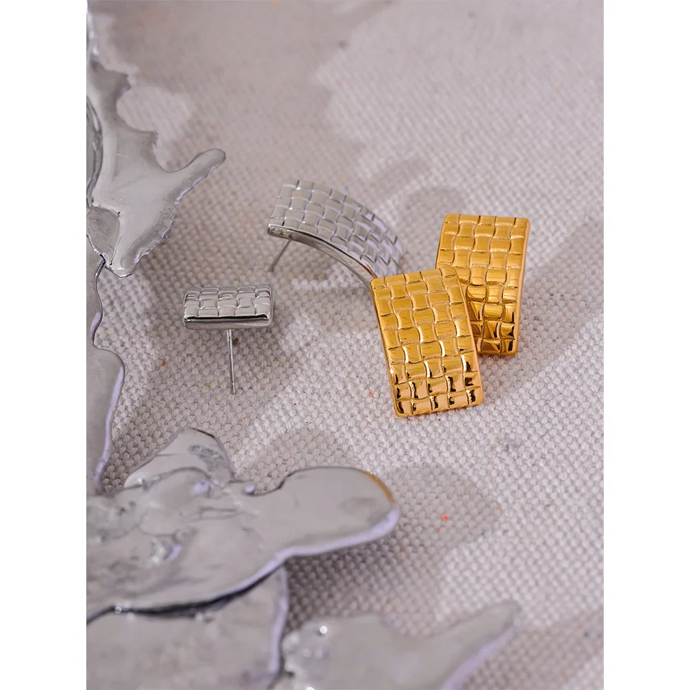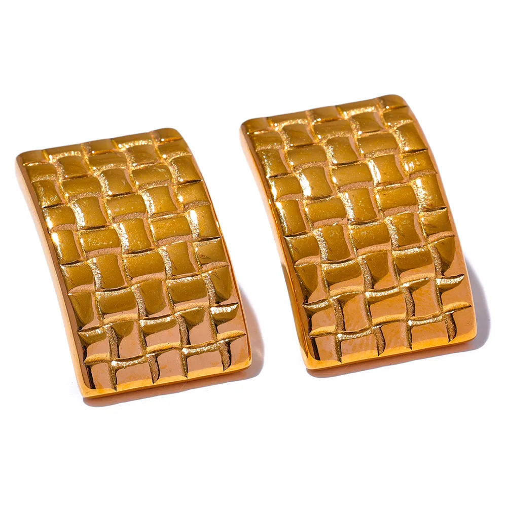 Make a bold yet refined statement with the Gail Rectangle Stud Earrings from Huna Jewelry. These oversized rectangular studs feature an eye-catching weave-like texture, adding depth and detail to a modern silhouette. The irregular rectangular pattern offers a contemporary twist on classic geometric design. Crafted with care and finished in polished metal, they elevate everyday styling with ease. A standout addition for those who appreciate distinctive textures and clean lines.