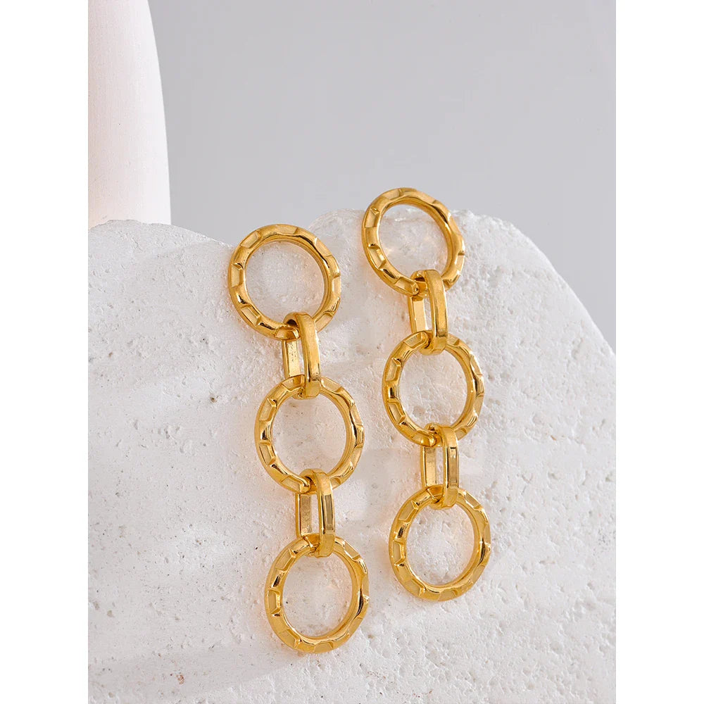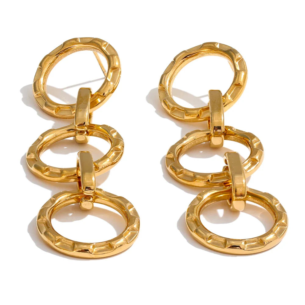 • Design: Three hollow round shapes connected with metal links for a dynamic drop effect
