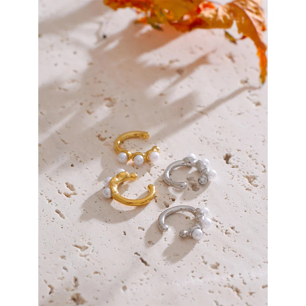 A minimalist piece with timeless appeal, the June Pearl Ear Cuff from Huna Jewelry adds subtle elegance—no piercing required. This stainless steel ear cuff features three simulated pearls in a streamlined geometric form, offering a secure and stylish fit. Its polished, waterproof design makes it a go-to accessory for modern layering or solo wear. A lightweight statement you can wear all day.