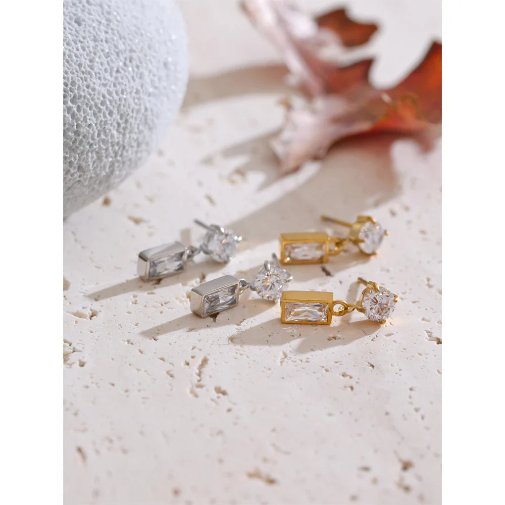 • Design: Round zirconia stud paired with a dangling rectangular stone for a clean, elegant drop effect