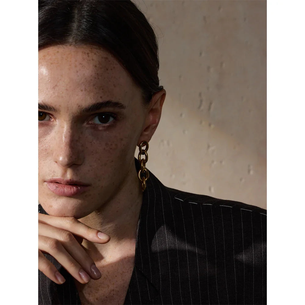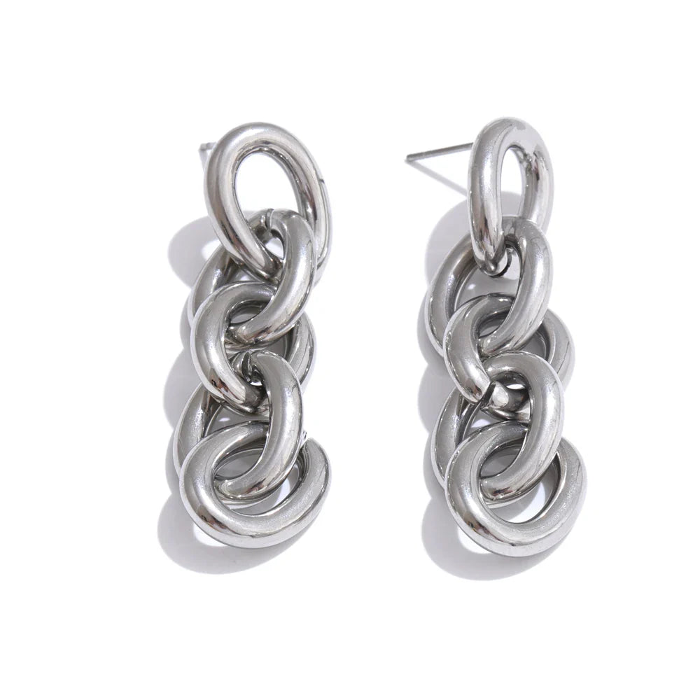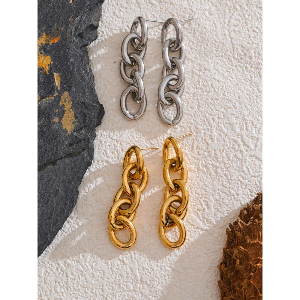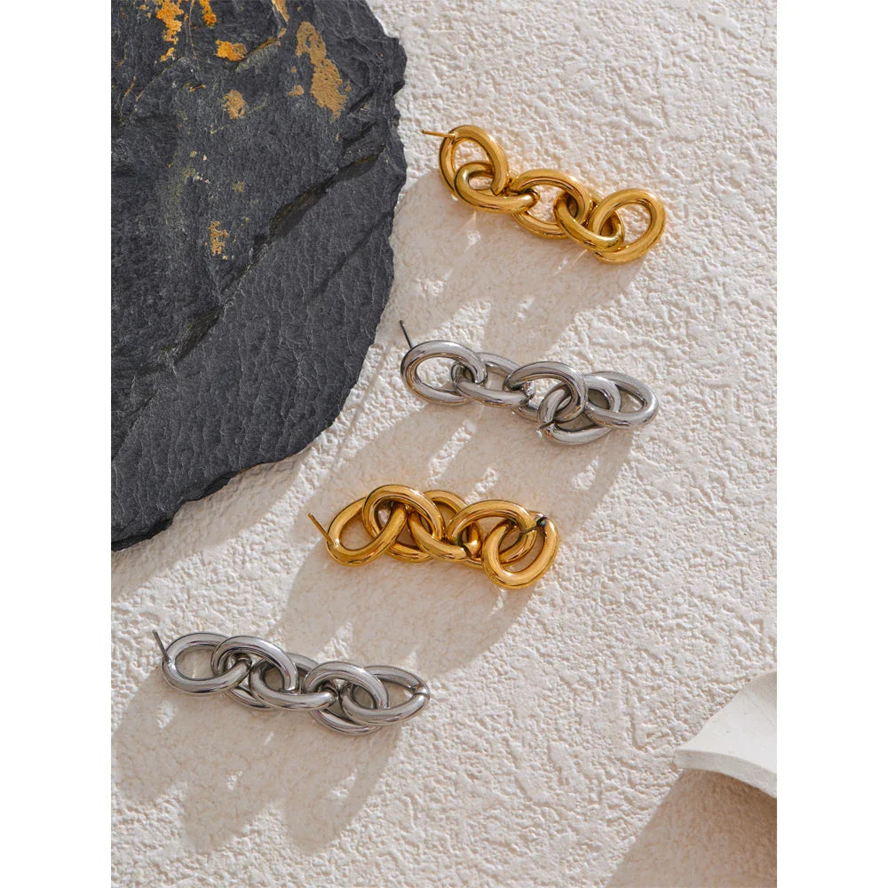 Add elegance to your collection with the "Eterno Encanto" Dangle Earrings from Huna Jewelry. Crafted from 18K gold-plated stainless steel, these earrings feature a sleek, modern geometric design. Their lightweight, hypoallergenic build ensures comfort for everyday wear, while the water-resistant finish keeps them shining for years to come. Perfect for elevating casual or formal outfits, these earrings are a versatile and timeless accessory.