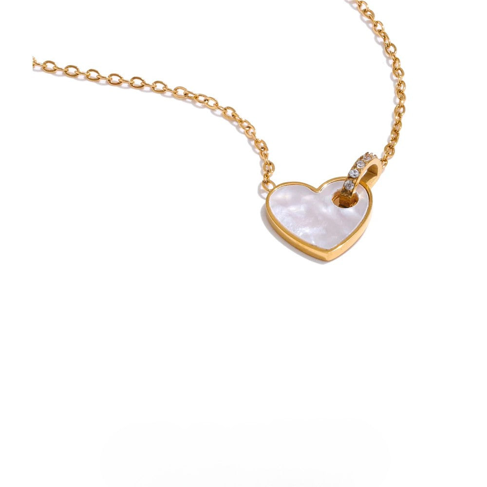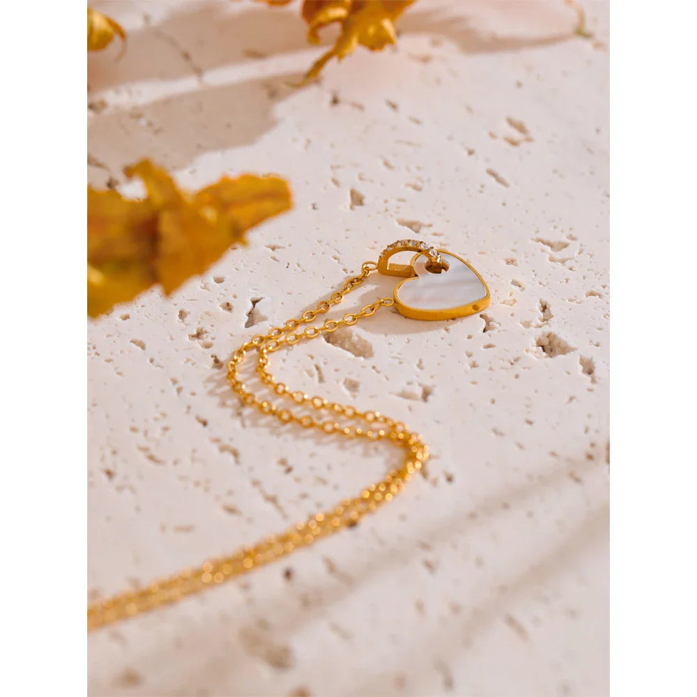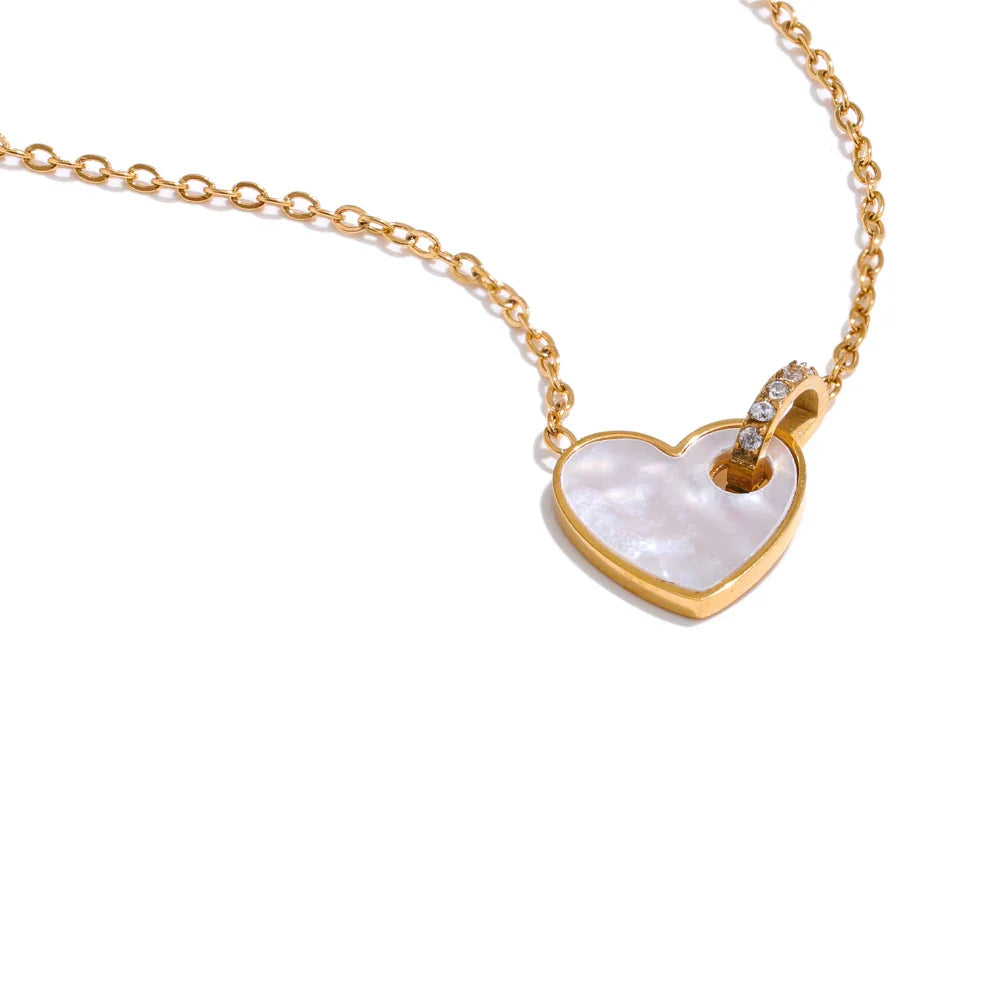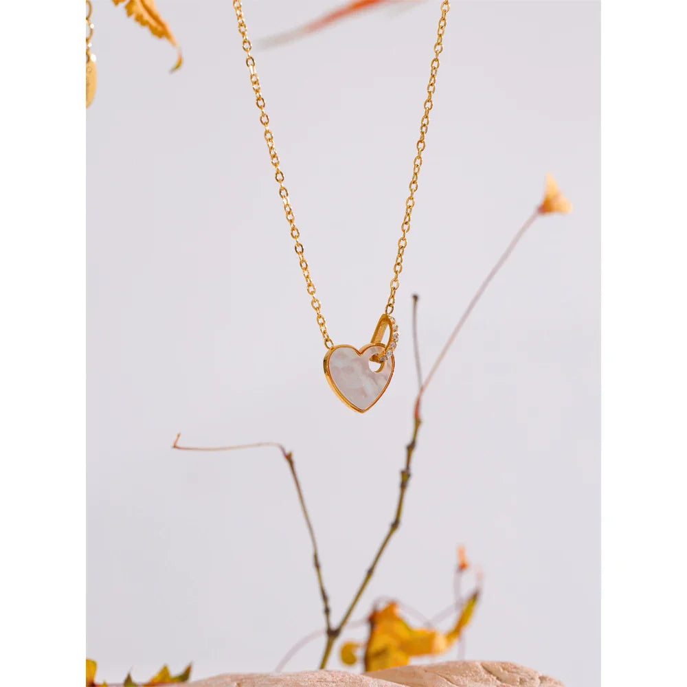 The Dolly Heart Shell Pendant Necklace from Huna Jewelry blends soft romance with modern design. Featuring a heart-shaped pendant inlaid with natural white shell, it’s pierced by a hollow D-shaped charm accented with mini zirconia stones, all suspended from a thin, delicate gold-tone chain. It’s perfect for subtle everyday sparkle or a thoughtful gift.