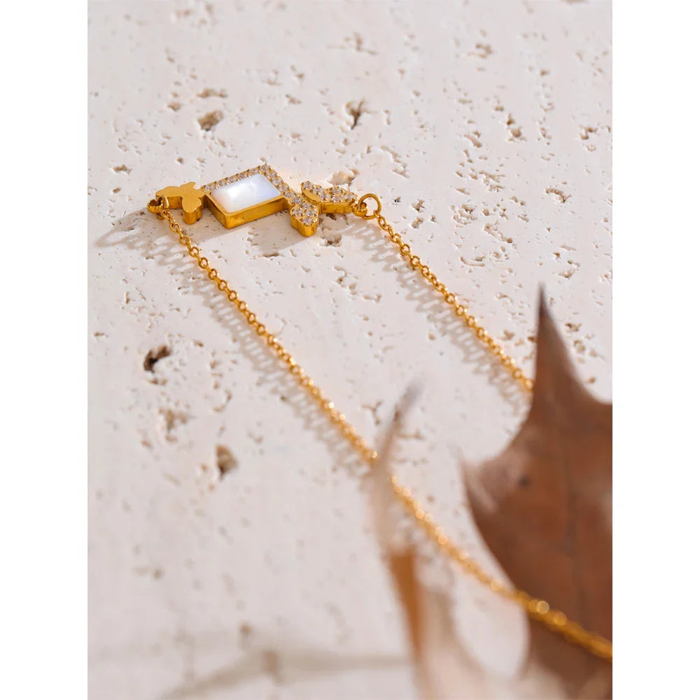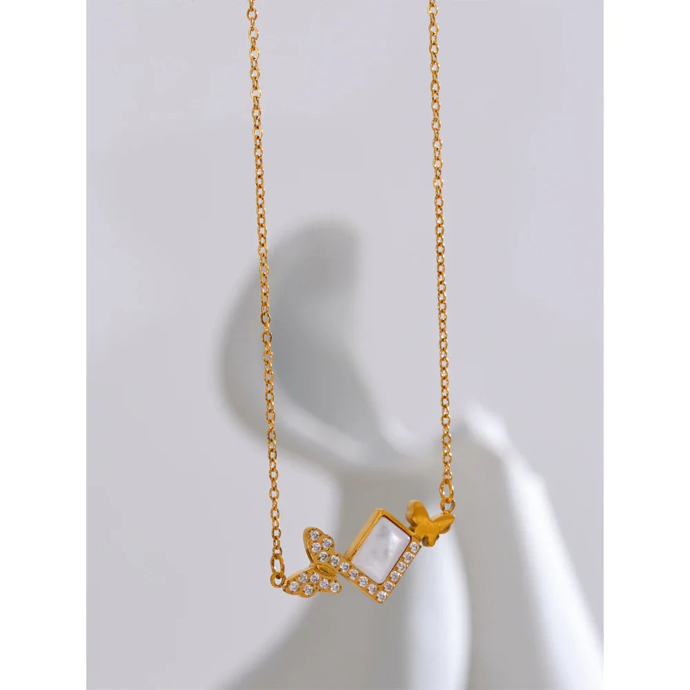 The Ginny Butterfly Pendant Necklace from Huna Jewelry features a square-shaped charm inlaid with natural shell, half-lined with shimmering mini zirconia stones. On opposite edges of the charm are two butterfly silhouettes—one filled with zirconia for a subtle sparkle, and the other in polished gold-tone stainless steel for a clean, modern contrast. A slim chain completes the refined look.
