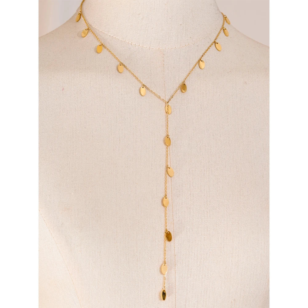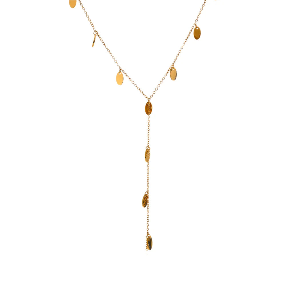 Elevate your style with the Kaori Leaves Drop Y Necklace from Huna Jewelry. This delicate and minimalist necklace features a thin Y-chain design adorned with small, sleek leaf silhouettes for an effortlessly elegant touch. Crafted from high-quality stainless steel with 18K PVD gold plating, this piece is waterproof, tarnish-resistant, and perfect for everyday wear. Whether you're dressing up for a special occasion or adding a nature-inspired charm to your outfit, this timeless leaf drop necklace is a must-have accessory.