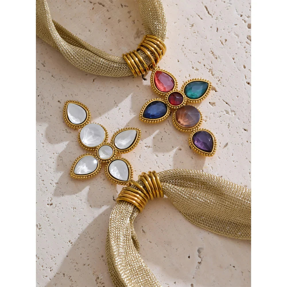 Natalie Cross Pendant Necklace – Shiny Glass Charm on Fabric Cord | Huna Jewelry