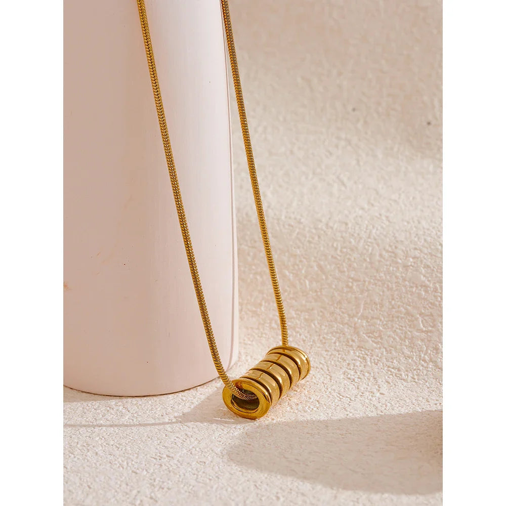 Make a bold statement with the Yvaine Swirl Tube Pendant Necklace from Huna Jewelry. This sleek and modern piece features a tube swirl pendant suspended on a delicate yet durable chain, offering a unique and sophisticated look. Crafted from 18K gold-plated stainless steel, this necklace is waterproof, tarnish-resistant, and perfect for everyday wear or special occasions.