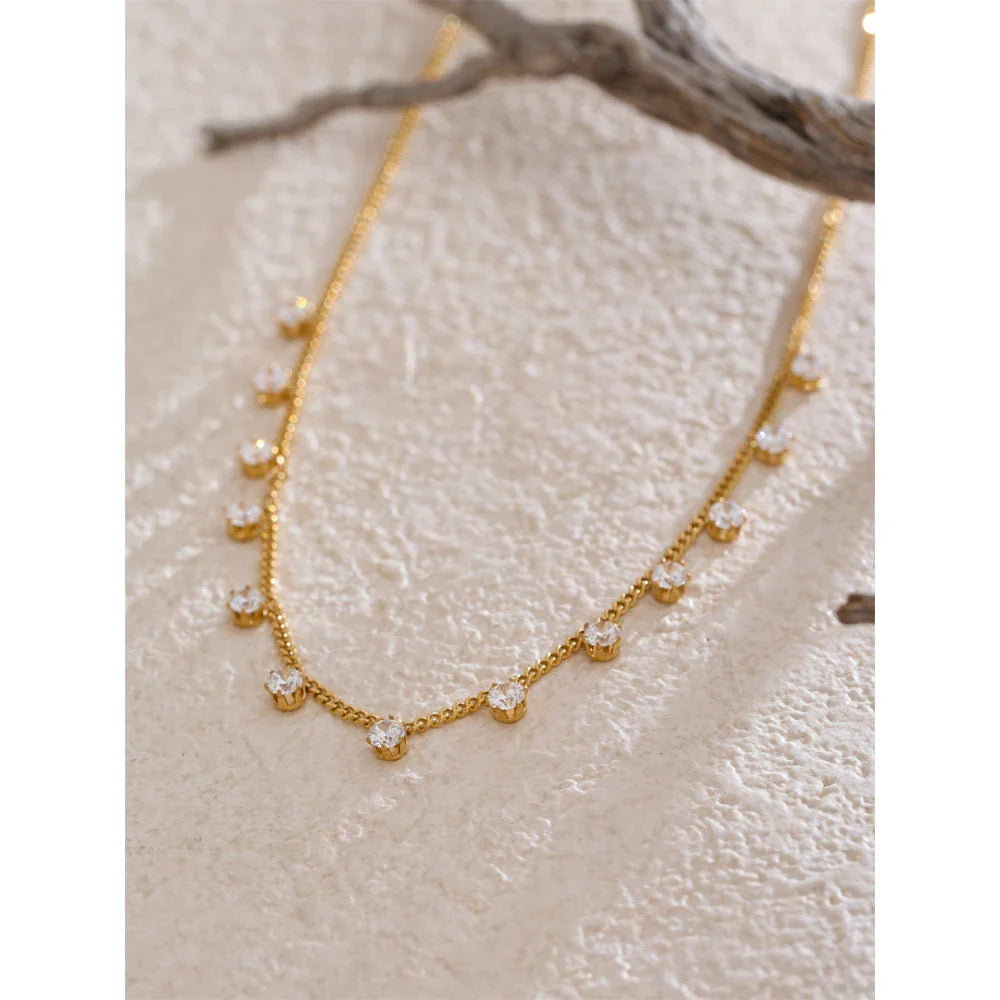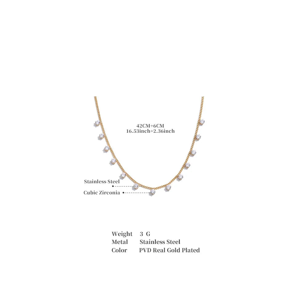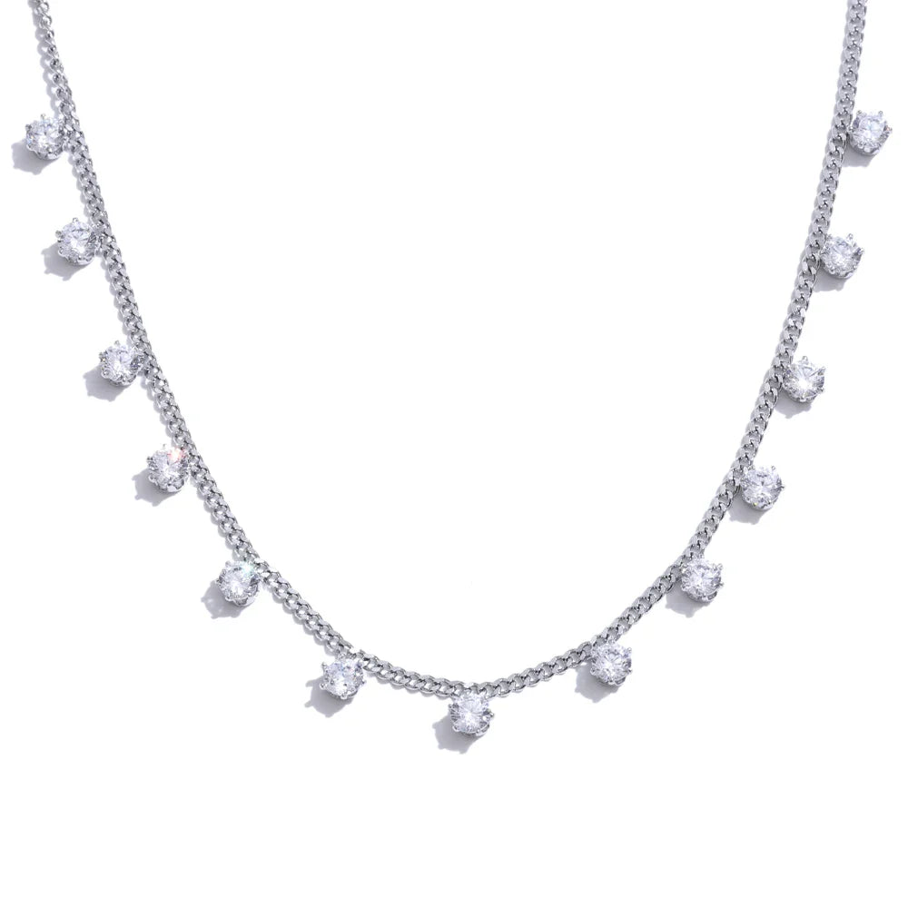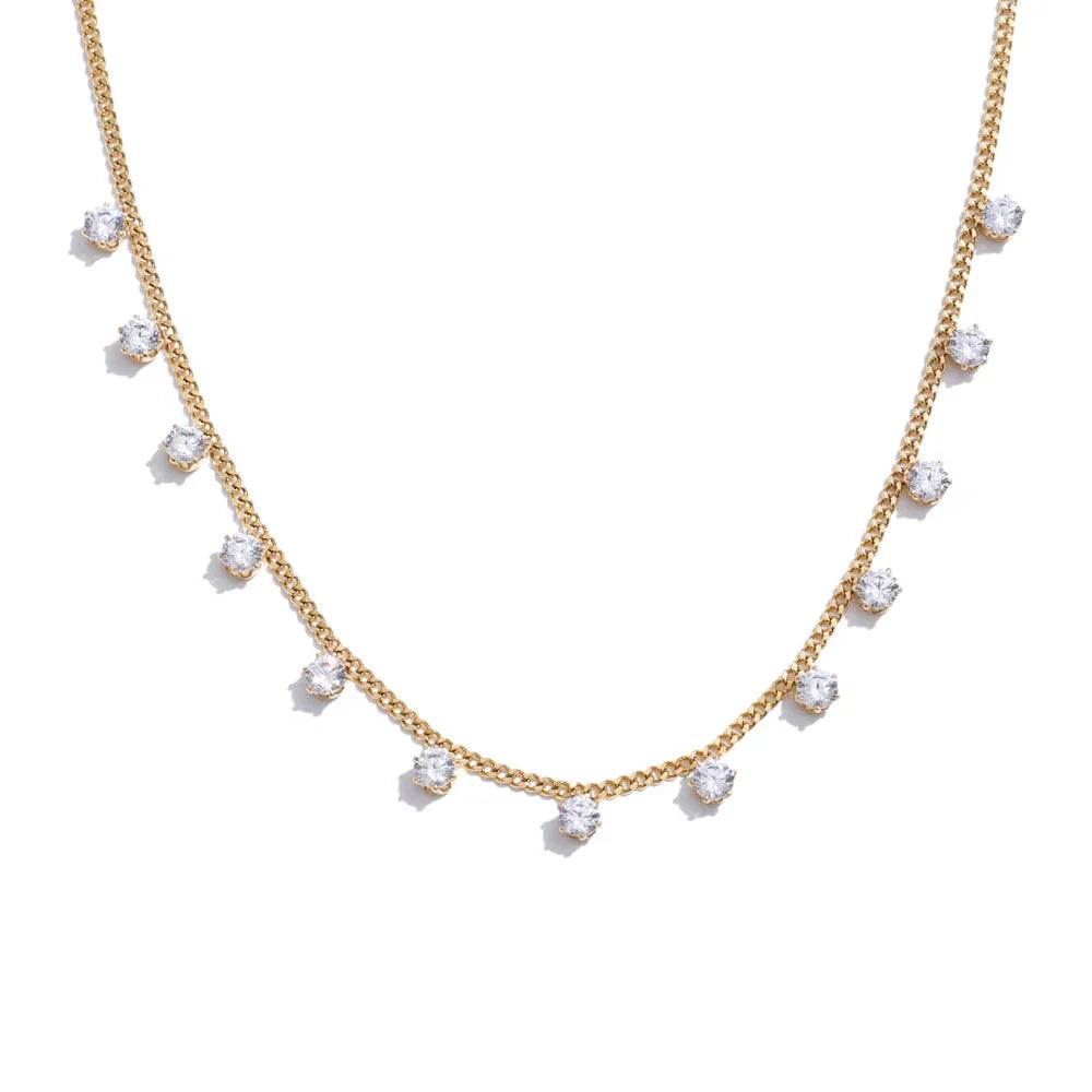 Diseño: Cadena de eslabones finos con dijes de circonitas suspendidas espaciadas para un efecto brillante y flotante.