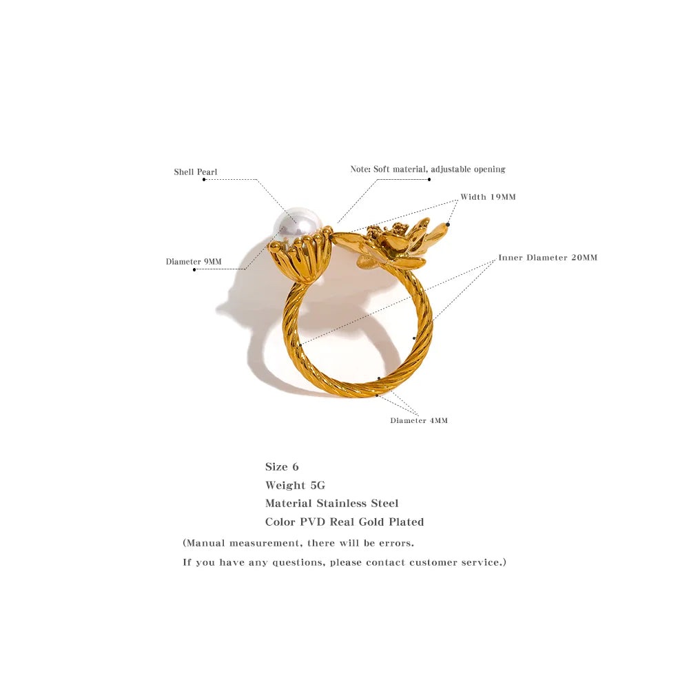 Pridėkite šiek tiek Suteikite savo papuošalų kolekcijai grakštumo ir elegancijos su „Huna Jewelry“ Margaret perlų žiedu. Šis subtilus atviras žiedas pasižymi blizgančia perlo gėle viename gale ir įmantria auksine gėle kitame gale, sukurdamas tobulą rafinuotumo ir žavesio pusiausvyrą. Pagamintas iš aukštos kokybės nerūdijančio plieno ir padengtas vandeniui atspariu PVD auksu, šis žiedas yra patvarus, atsparus blukimui ir idealiai tinka kasdieniam nešiojimui. Reguliuojamas atviras dizainas užtikrina patogų prigludimą daugumai pirštų, todėl tai universalus ir nesenstantis papuošalas bet kokiai progai.