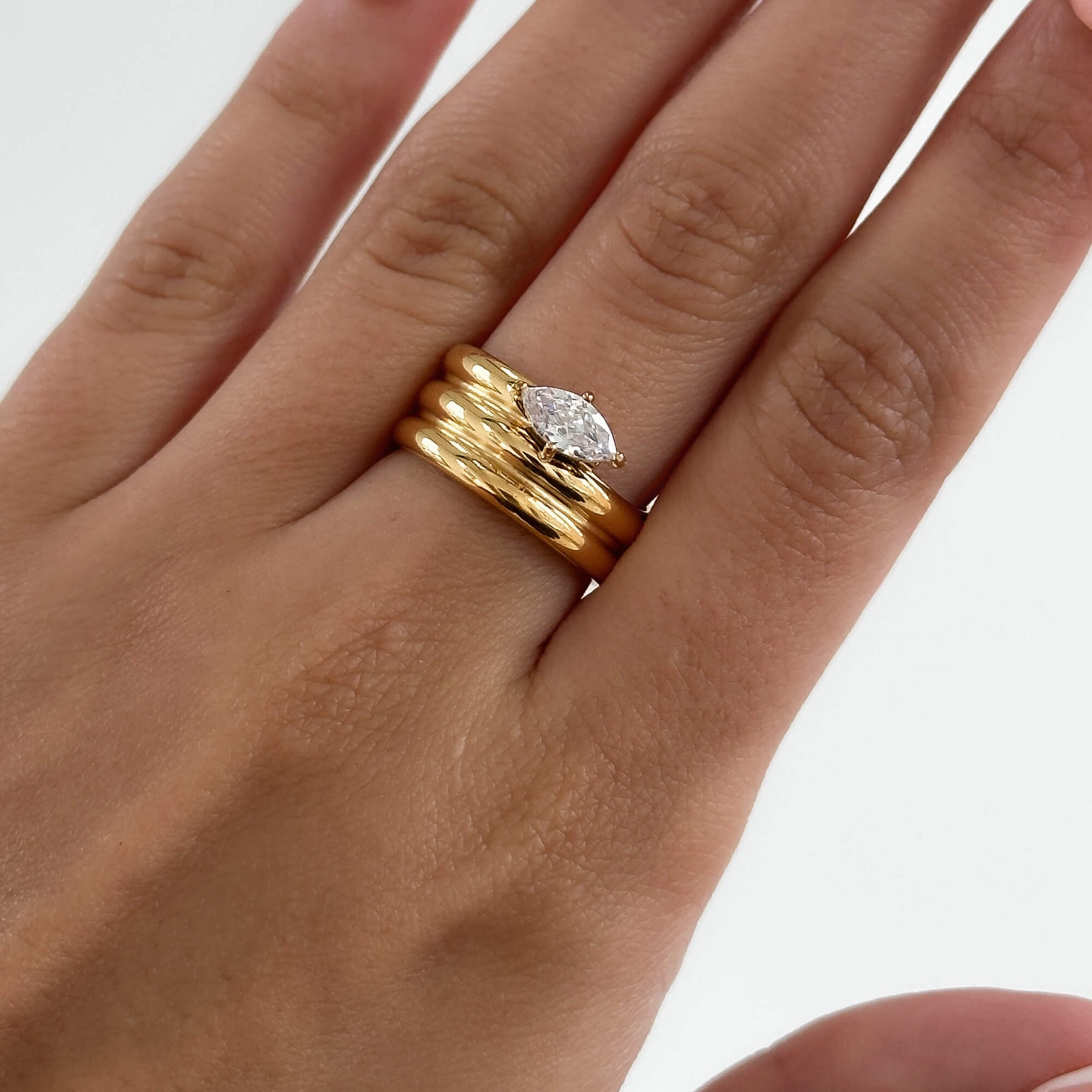 „Huna Jewelry“ „Emilijos“ žiedas spinduliuoja vintažiniu žavesiu, pasižyminčiu drąsiu, trijų eilių lankeliu, įkvėptu 1940-ųjų elegancijos. Pagamintas iš 18 karatų auksu padengto nerūdijančio plieno, žiedas puoštas akinančiu kubiniu cirkonio akmeniu, suteikiančiu nesenstantį, bet modernų akcentą. Šis patvarus žiedas, netamsėjantis ir atsparus vandeniui, puikiai tinka tiek kasdieniam rafinuotumui, tiek išskirtinėms akimirkoms.