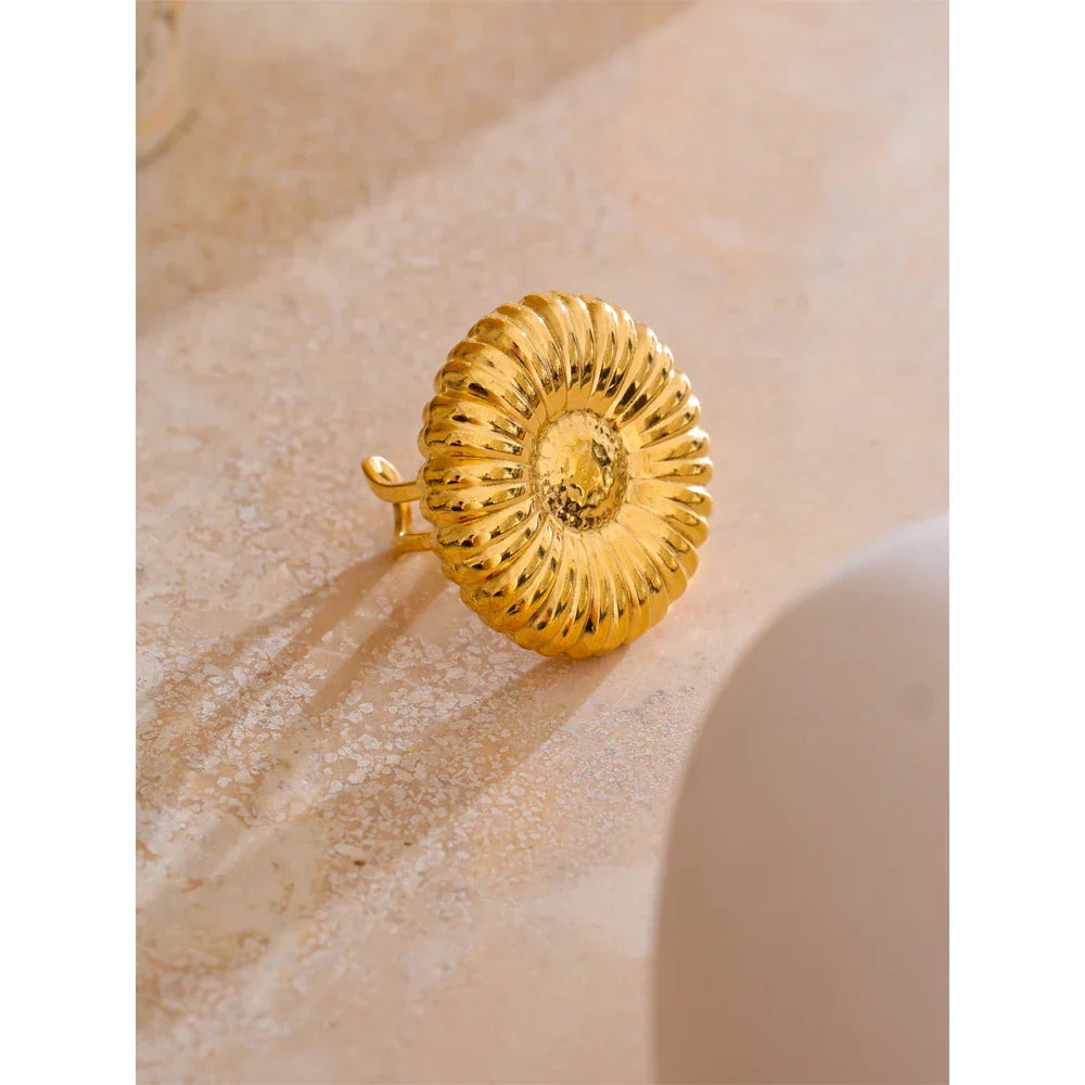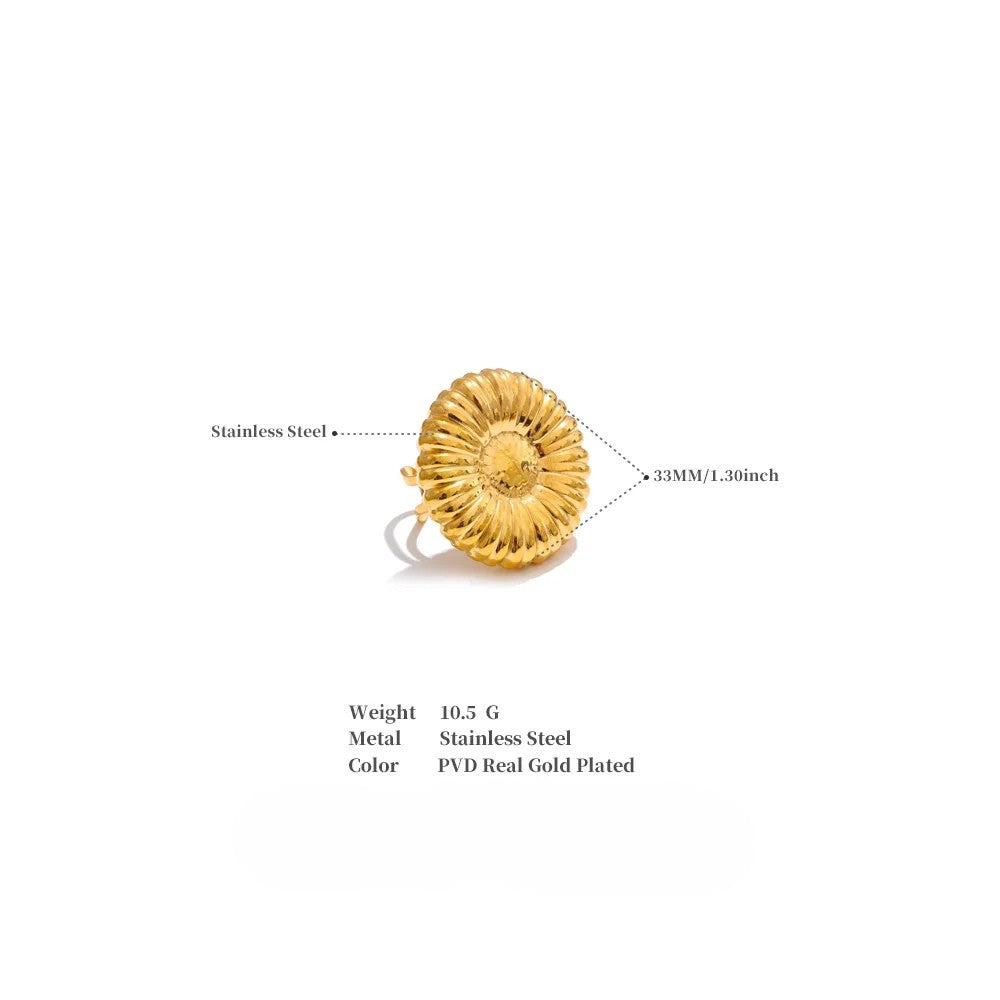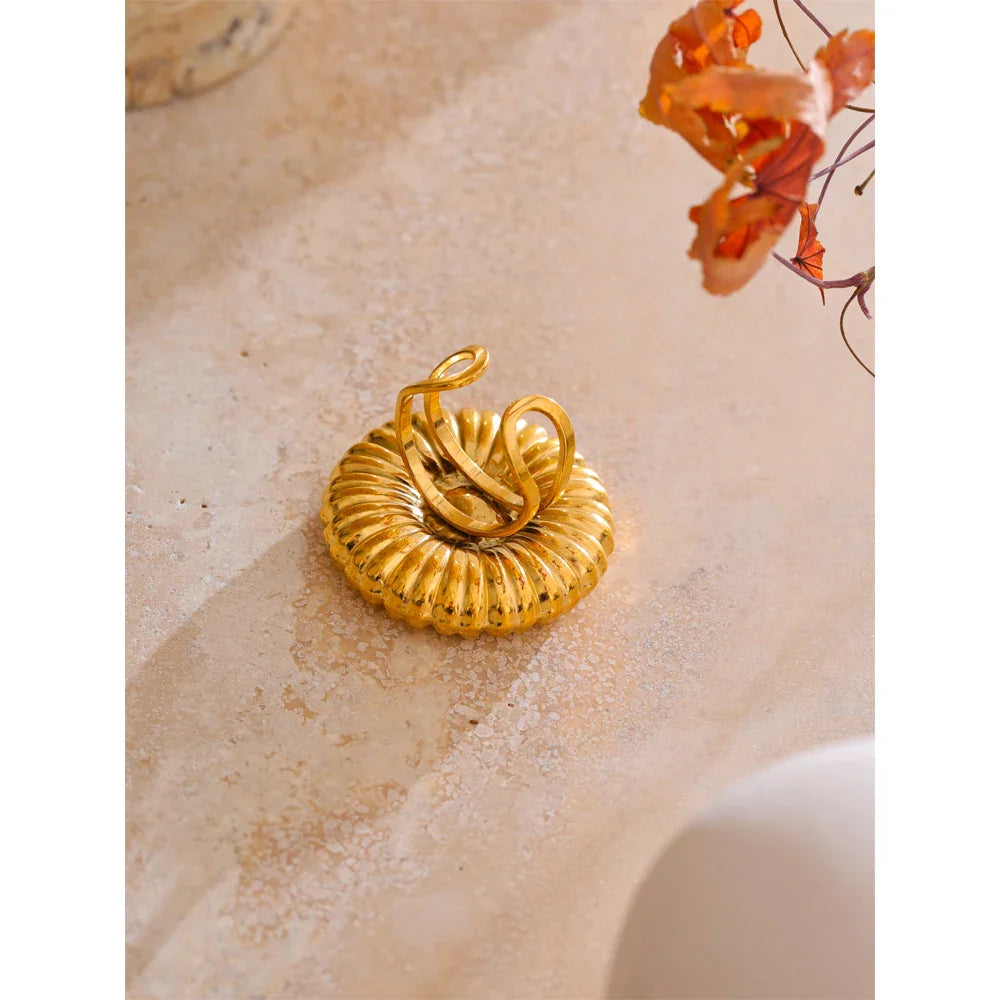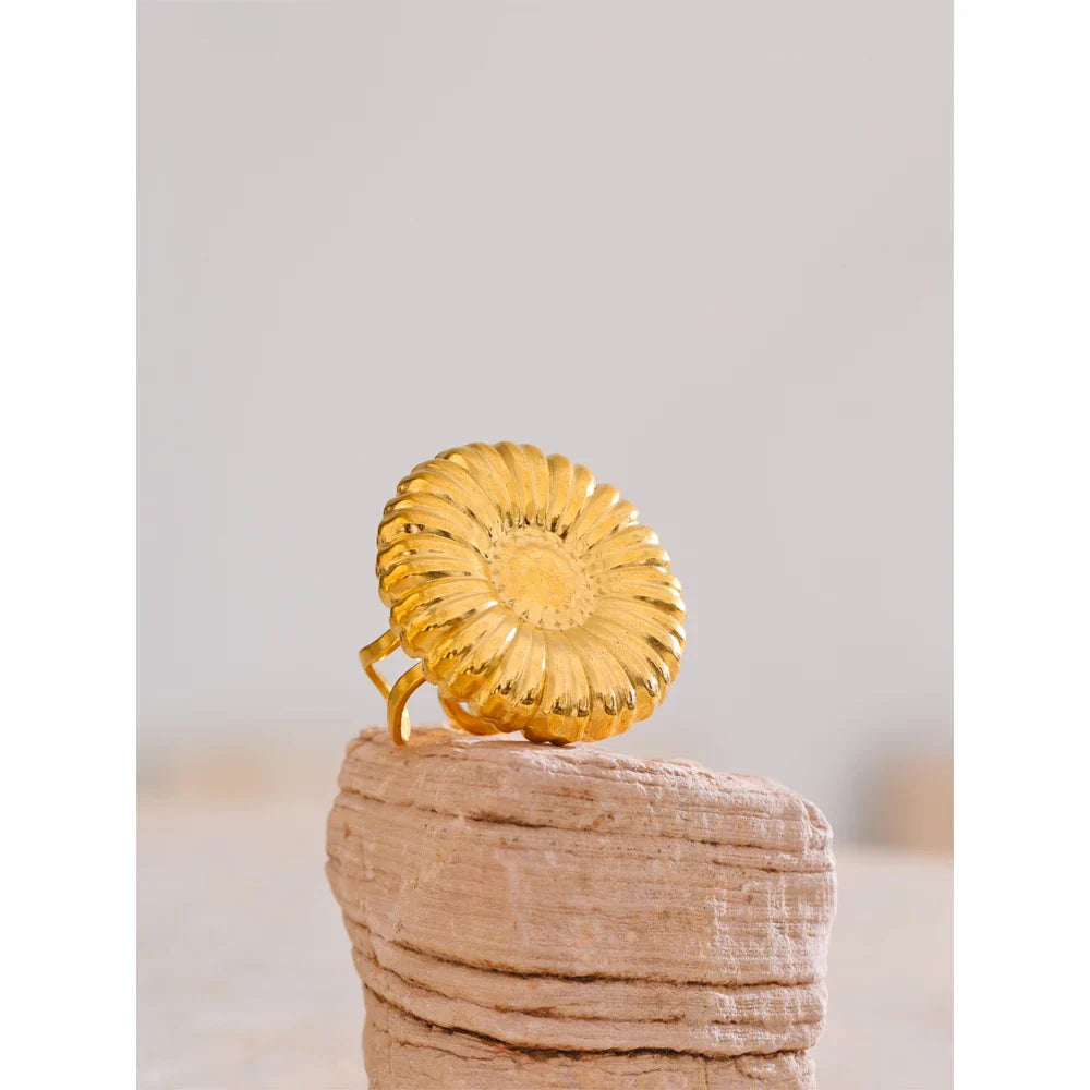 „Huna Jewelry“ „Flora Chunky Flower Cuff Ring“ rankogalių žiedas pasižymi atvira juostele ir apvalia, skulptūriška gėle centre. Storas siluetas ir reguliuojamas dizainas suteikia jam tvirtą, tačiau elegantišką jūsų kolekcijos papildymą – idealiai tinka tiek kasdienai, tiek stilingam apipavidalinimui. Modernus gėlių papuošalų variantas, pasiruošęs spindėti tiek solo, tiek ir sukrauti kelis kartus.