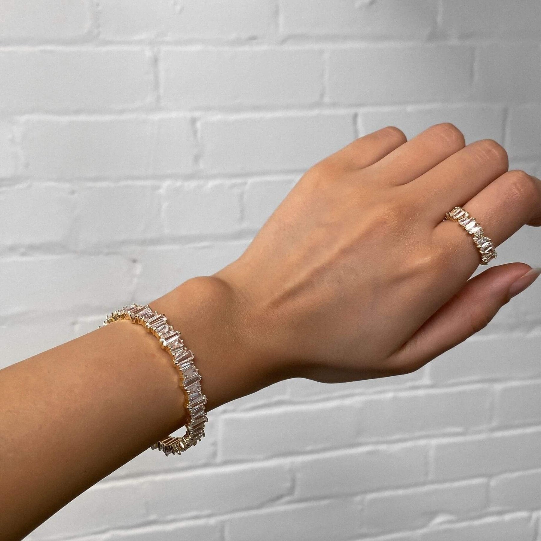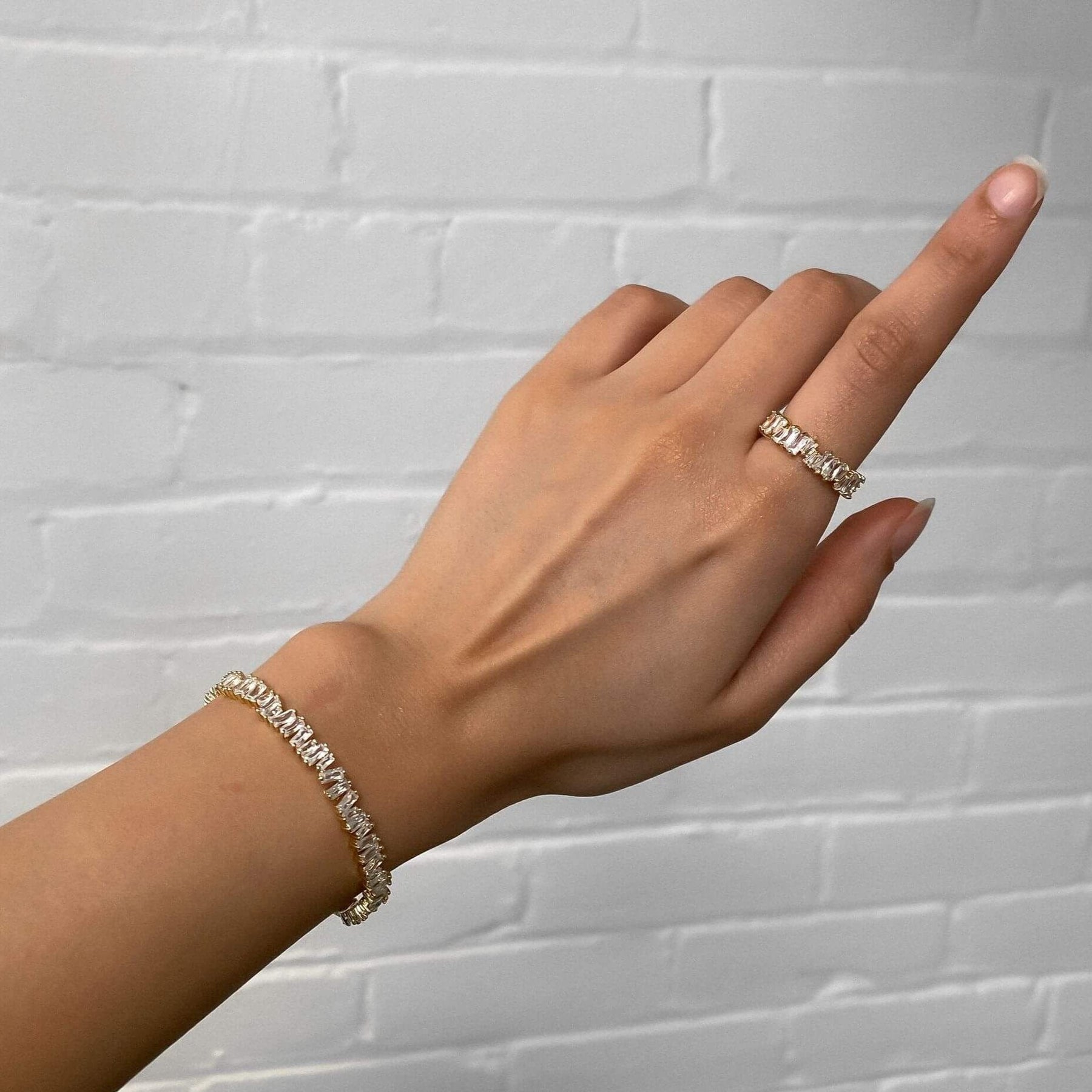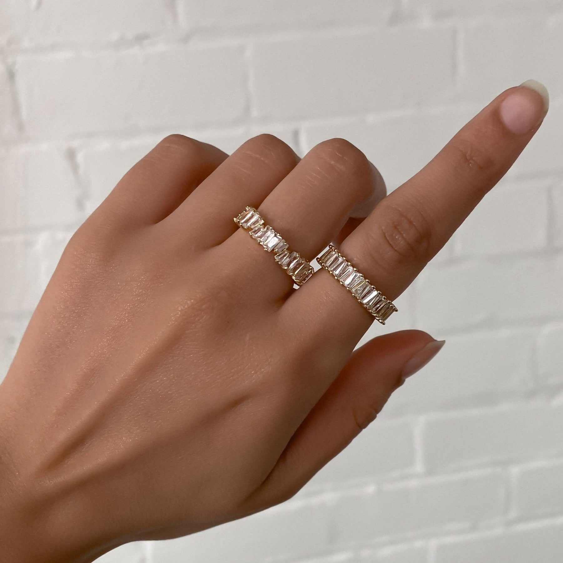 „Huda“ reguliuojamo dydžio bagetės formos žiedas – 18 karatų auksu padengtas ir cirkonio spalvos akmenimis | „Huna Jewelry“