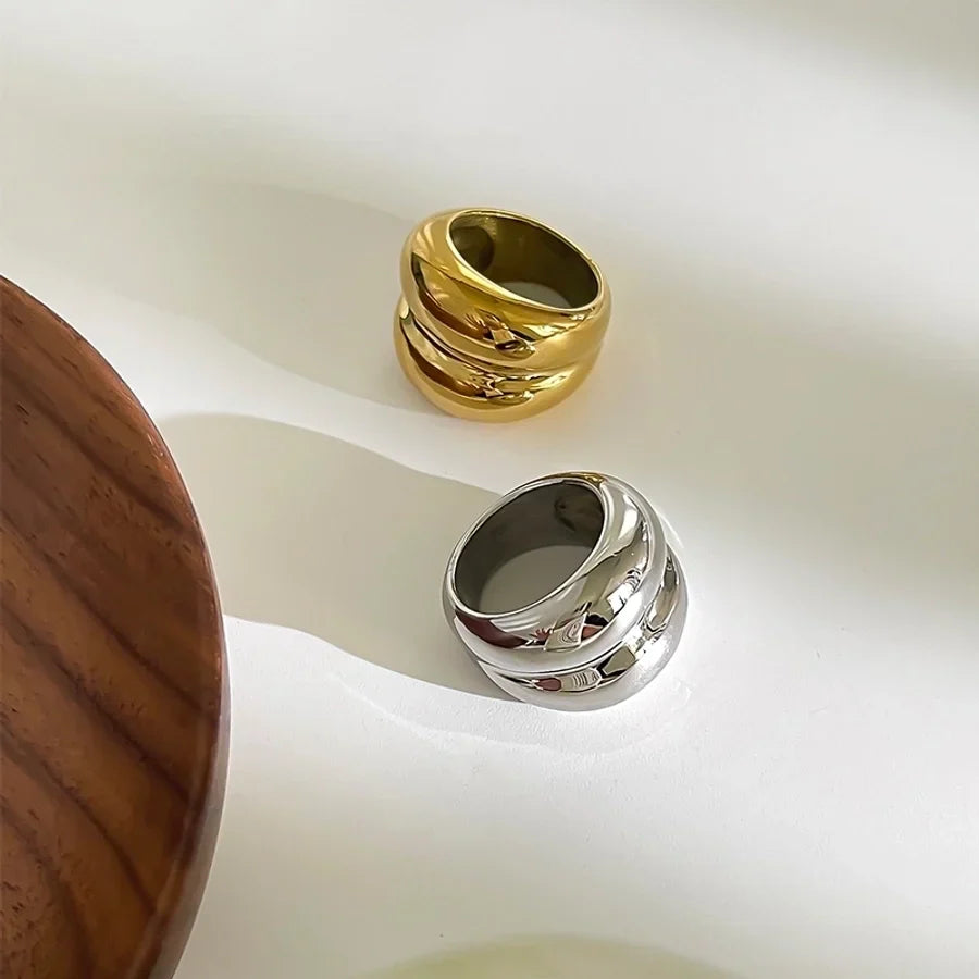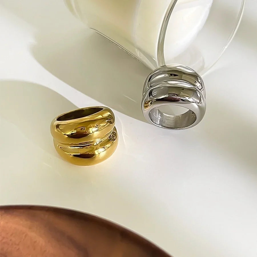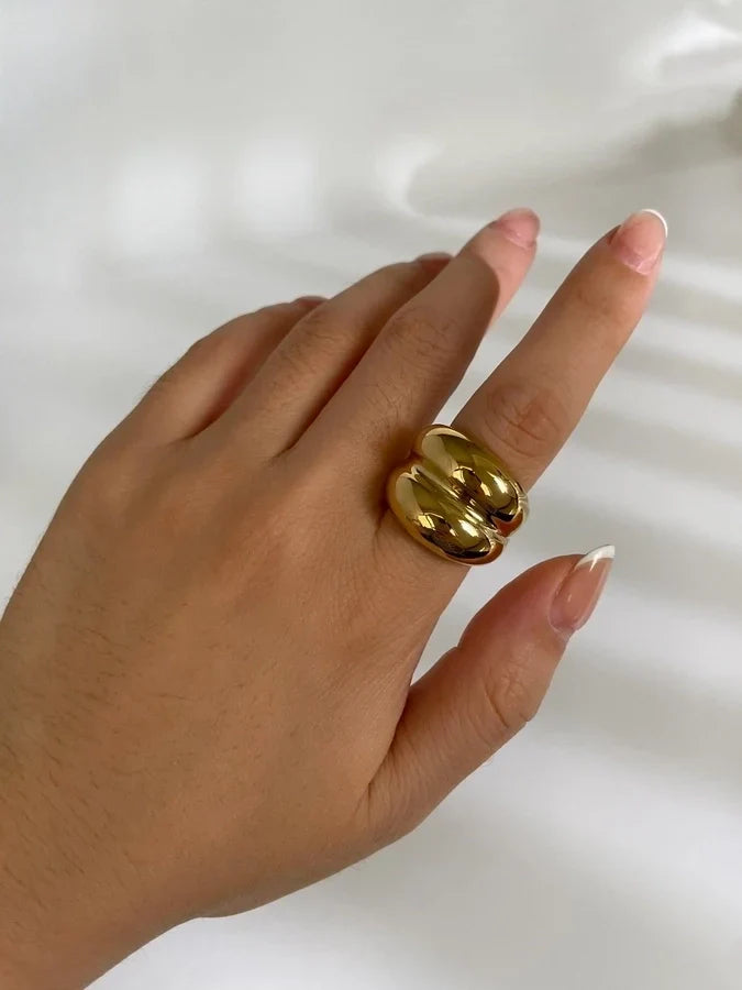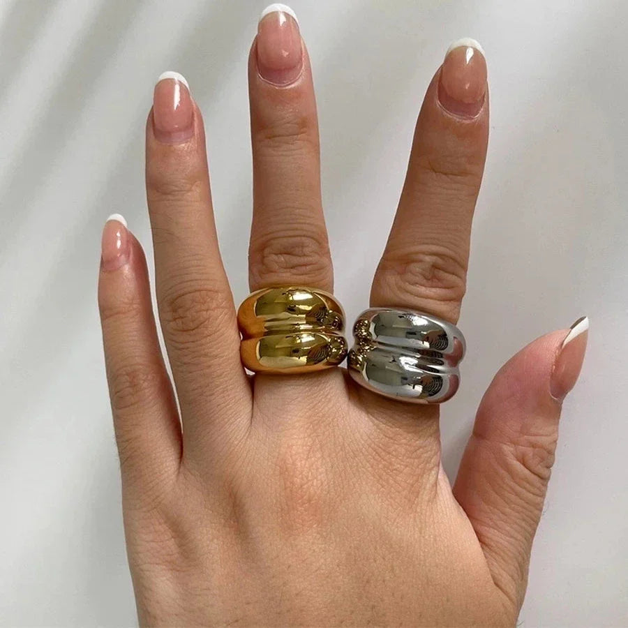 „Huna Jewelry“ prabangūs dvigubi drąsūs žavūs žiedai spinduliuoja šiuolaikiška elegancija. Pagaminti iš 18 karatų auksu padengto nerūdijančio plieno, šie drąsūs, masyvūs žiedai lengvai derina modernų ir klasikinį stilius. Jie atsparūs blukimui ir vandeniui, pasižymi ilgalaikiu patvarumu ir blizgesiu. Šie žiedai puikiai tinka išsiskirti ir yra pakankamai universalūs, kad būtų galima nešioti kasdien arba ypatingoms progoms.