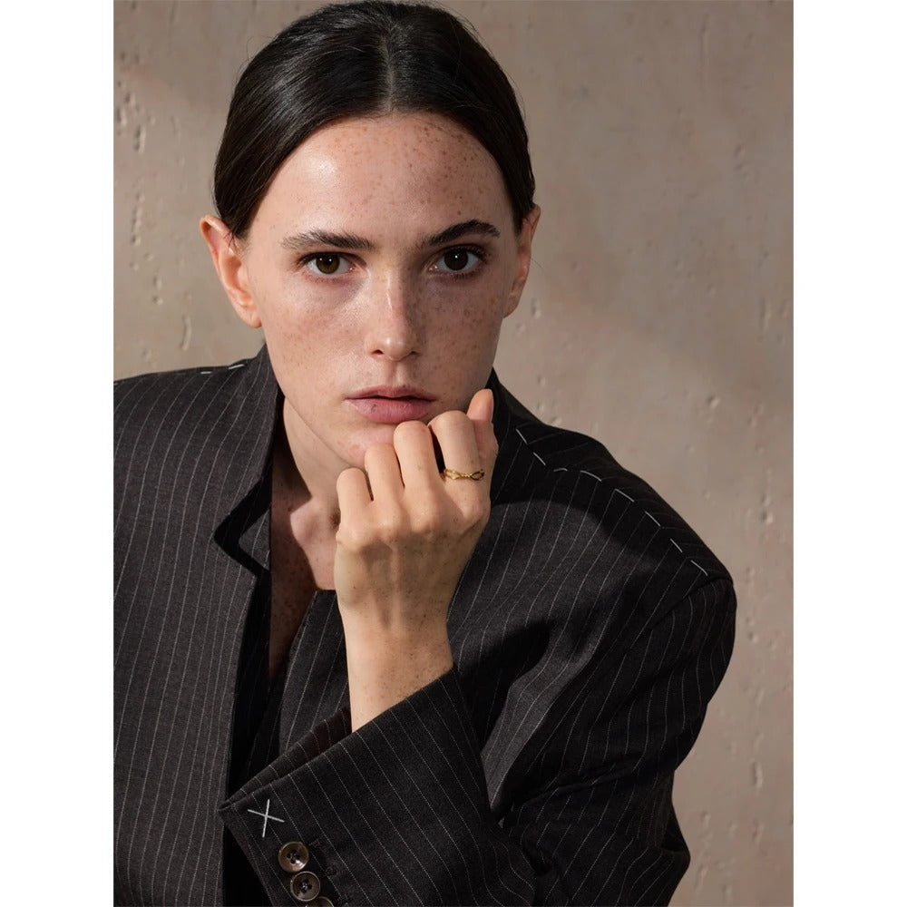 Suteikite savo kasdieniam įvaizdžiui rafinuotumo su „Huna Jewelry“ „Veronica Twist“ žiedu. Šis minimalistinis žiedas, pasižymintis plonu profiliu ir subtiliu susuktu priekiu, suteikia bet kokiai aprangai modernumo. Jis pagamintas iš nerūdijančio plieno ir padengtas patvariu auksu, todėl yra atsparus vandeniui ir puikiai tinka nešioti kasdien. Elegantiškas, tačiau santūrus, jis puikiai tinka nešioti tiek kelis žiedus vienu metu, tiek vieną. Nesenstantis akcentas bet kuriai papuošalų kolekcijai.
