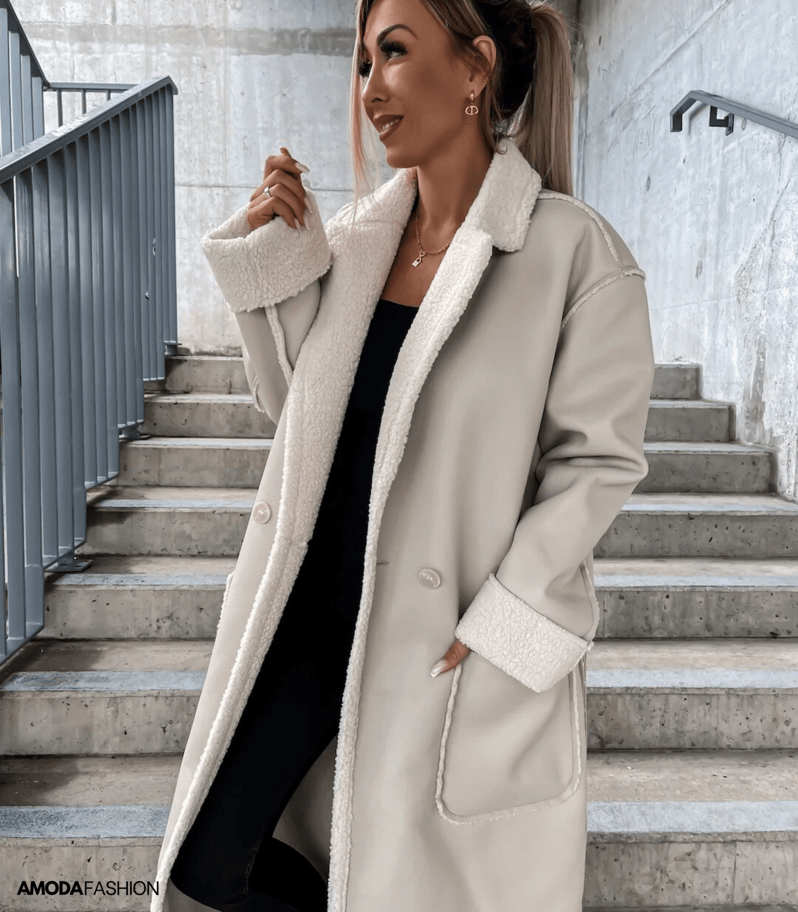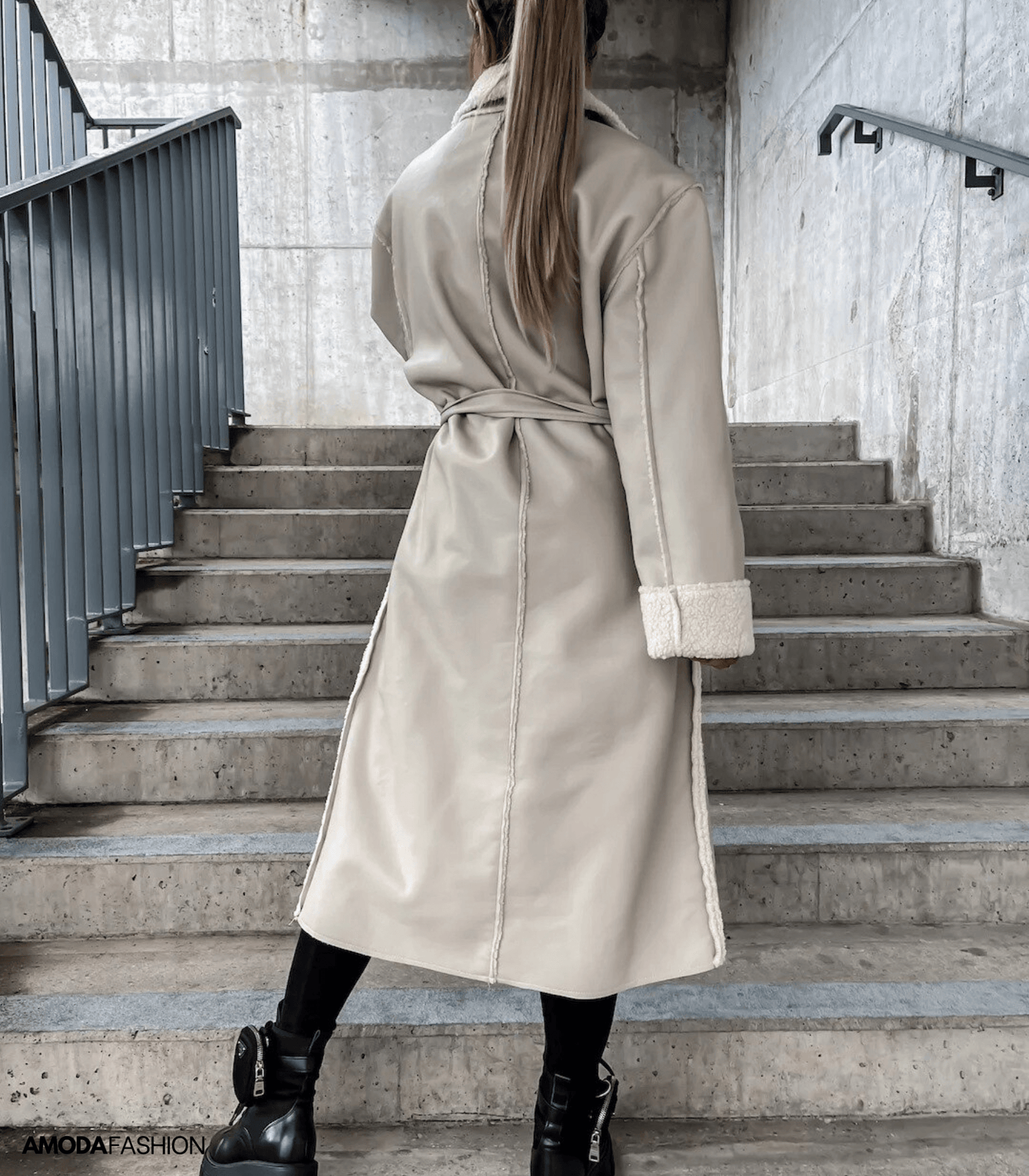 Moteriškas odinis paltas su fliso pamušalu ir diržu – stilingas ilgas švarkas šilumai ir komfortui šaltu oru