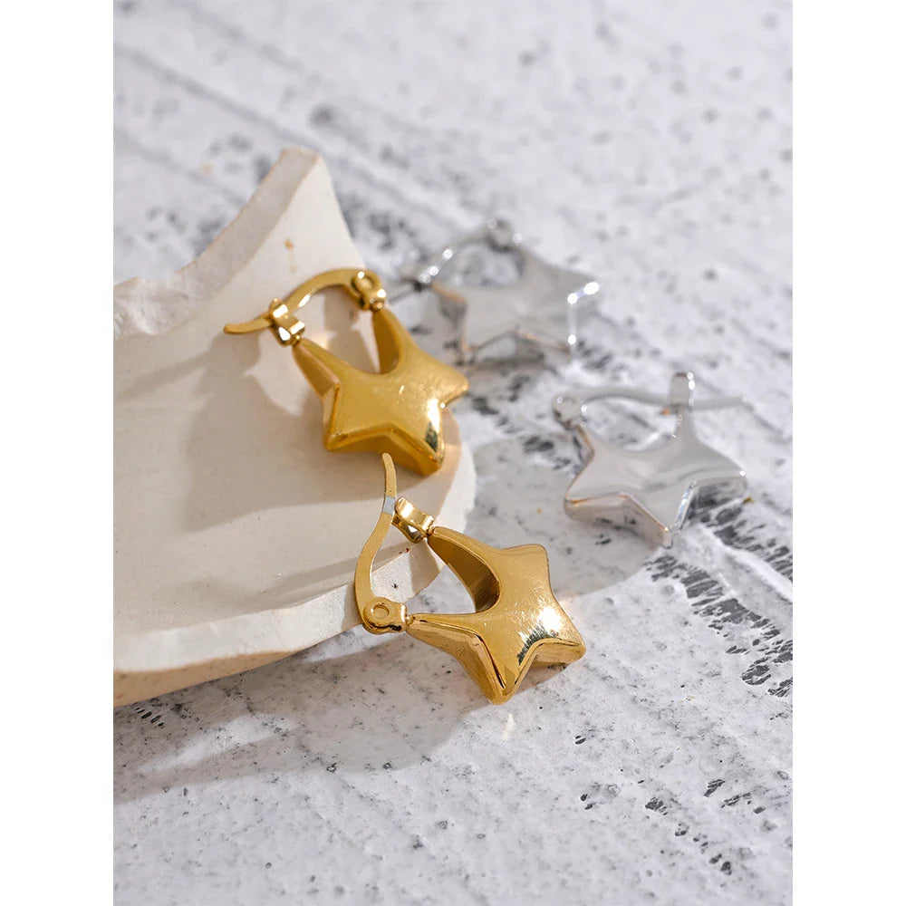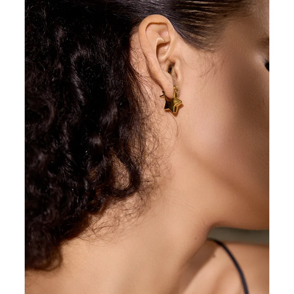 Add a celestial touch to your jewelry collection with the Amarilla Hollow Star Hoop Earrings from Huna Jewelry. These stylish hoops feature a unique star-shaped cutout design, blending elegance with a modern, playful twist. Crafted from high-quality stainless steel with 18K gold plating, they are lightweight, hypoallergenic, and resistant to tarnishing, making them perfect for all-day wear. Whether you're dressing up for a special occasion or adding a trendy touch to your everyday look, these earrings are the perfect statement piece.