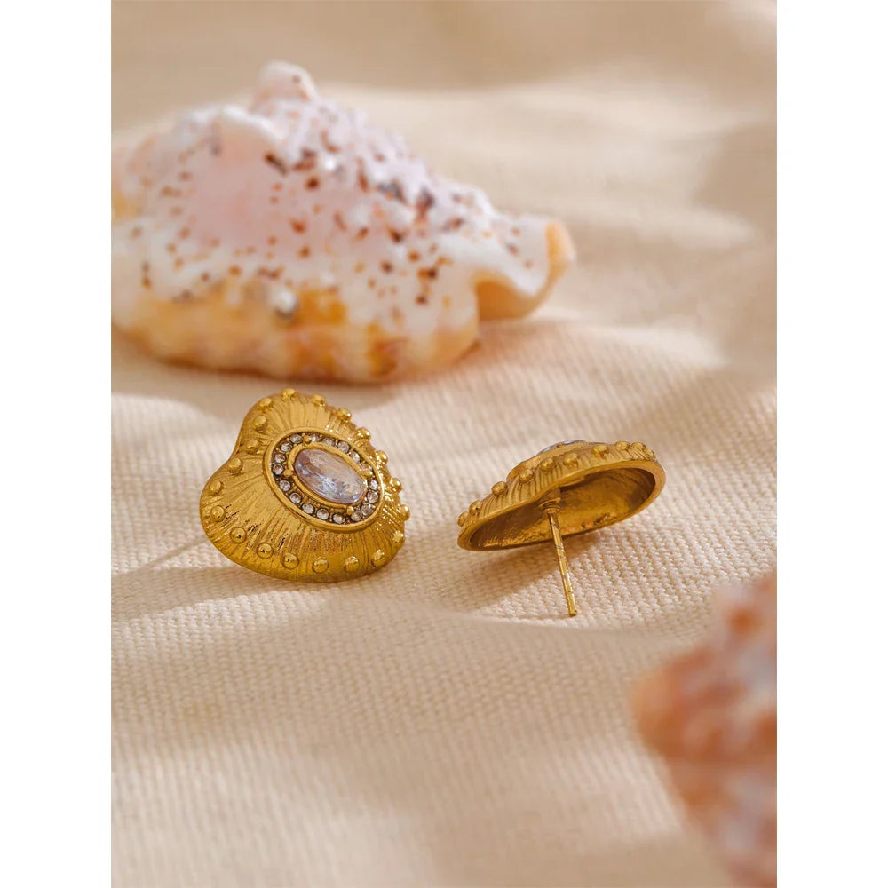 Add a touch of romance and brilliance to your jewelry collection with the Samara Sparkling Heart Stud Earrings from Huna Jewelry. Featuring a textured heart design adorned with a large cubic zirconia at the center, surrounded by smaller shimmering zirconia stones, these earrings radiate elegance and charm. Crafted from high-quality stainless steel with 18K PVD gold plating, they are tarnish-resistant, hypoallergenic, and perfect for daily wear. Whether you're looking for a heartfelt gift or a dazzling accessory for yourself, these sparkling heart earrings are a timeless choice.