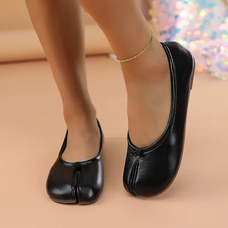 Odkrijte popolno mešanico modernega dizajna in klasične elegance z našimi ravnimi čevlji z razcepljenim prstom. Ti čevlji so izdelani iz gladkega umetnega usnja in imajo edinstveno silhueto tabi, ki izstopa v vsakem okolju. Mehka podloga v notranjosti zagotavlja celodnevno udobje, zaradi česar so idealni tako za sproščene izhode kot za elegantne dogodke.