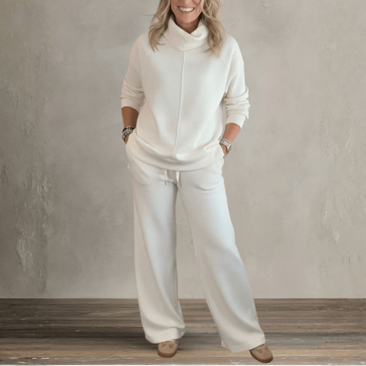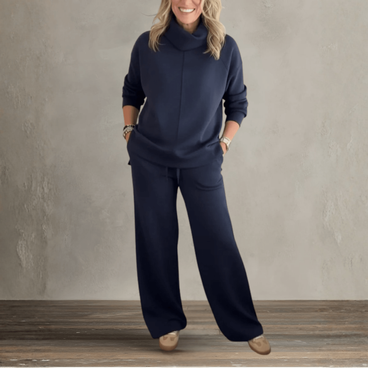 Ta elegantni dvodelni komplet ima visok ovratnik, ki lepo uokviri vaš obraz in odpravlja potrebo po šalu. Šik dizajn doda pridih prefinjenosti vašemu sproščenemu videzu, hkrati pa zagotavlja, da boste ostali udobni in modni.