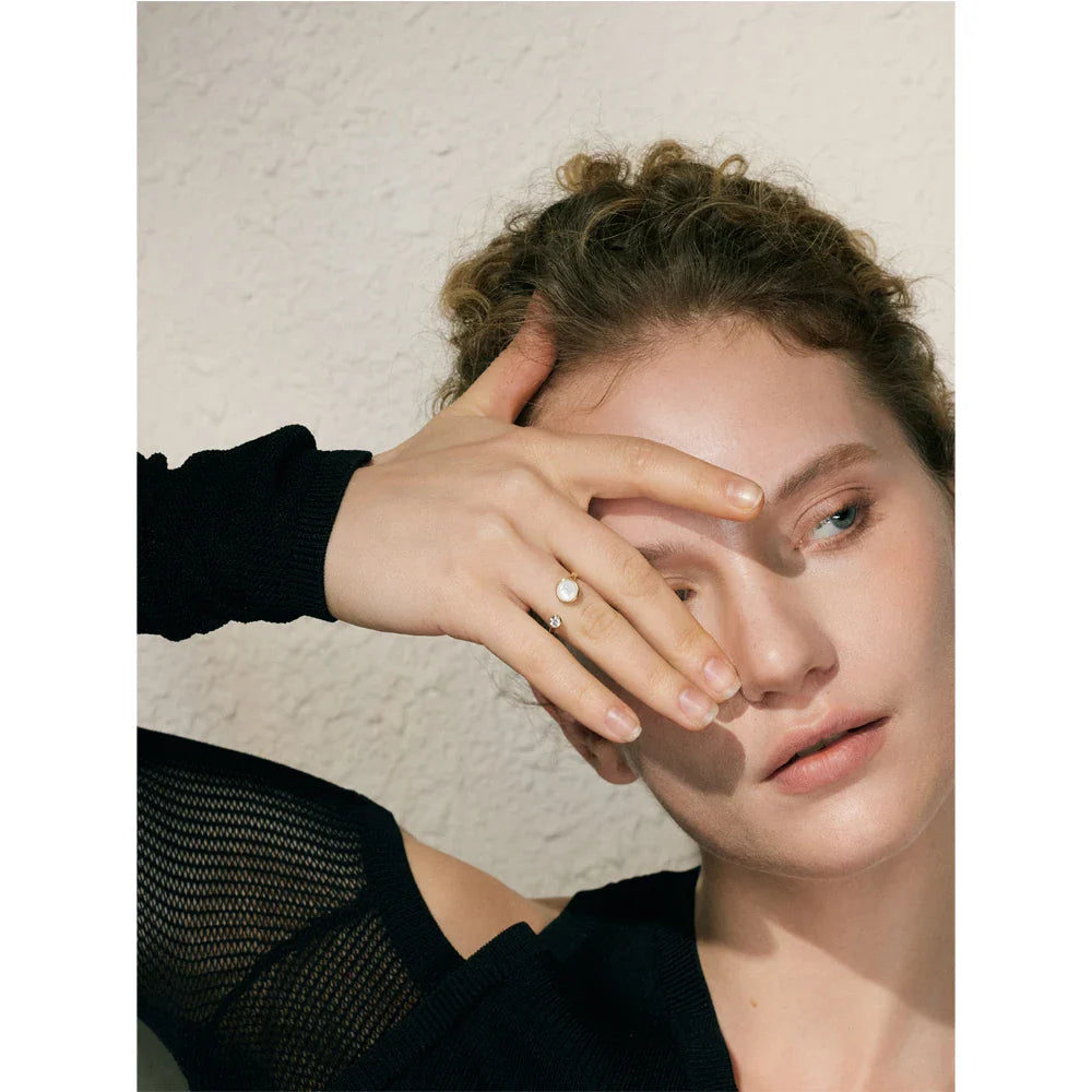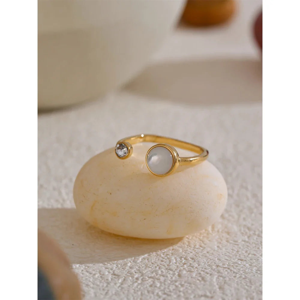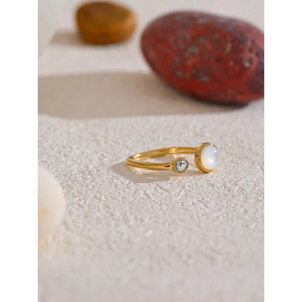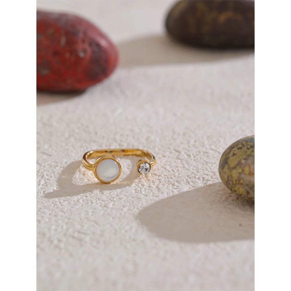 Nadgradite svojo zbirko nakita s prstanom Elowyn Shell znamke Huna Jewelry – kosom, ki združuje moderno eleganco in brezčasno prefinjenost. Ta nežni odprti prstan ima eleganten kvadratni obroč, okrašen z okroglim naravnim školjčnim vložkom na enem koncu in mini kubičnim cirkonijem na drugem, kar ustvarja subtilen, a presenetljiv kontrast. Ta nastavljiv in vodoodporen prstan, izdelan iz visokokakovostnega nerjavečega jekla z 18-karatnim PVD zlatom, ponuja razkošno, a udobno prileganje, zaradi česar je popoln tako za sproščeno kot za formalno nošenje.
