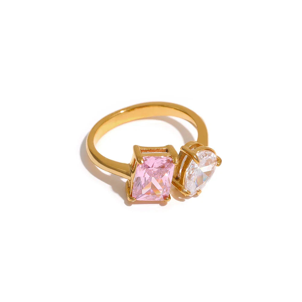 Dodajte kanček sijaja svoji zbirki nakita z briljantnim prstanom Lenora znamke Huna Jewelry. Ta nastavljiv odprt prstan ima bleščeče kubične cirkonije v obliki solze in kvadrata, ki ustvarjajo edinstven in eleganten dizajn. Izdelan je iz vodoodpornega, pravega pozlačenega nerjavečega jekla, zato je ta prstan vzdržljiv in eleganten. Ne glede na to, ali gre za zabavo, posebno priložnost ali vsakodnevno nošenje, je ta prstan popoln kos nakita.