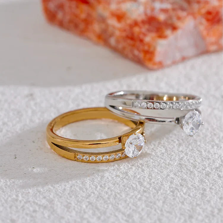 Dodajte pridih brezčasne elegance z dvoslojnim bleščečim prstanom Liliana znamke Huna Jewelry. Ta izvrstni kos se ponaša z nežno dvoslojno zasnovo, kjer je en obroček obložen z mini cirkoni za nežen lesk, drugi pa ima večji cirkonij na sredini za sijočo osrednjo točko. Ta prstan, izdelan iz visokokakovostnega nerjavečega jekla z 18-karatnim zlatom, je odporen proti oksidaciji, vzdržljiv in popoln tako za vsakodnevno nošenje kot za posebne priložnosti.