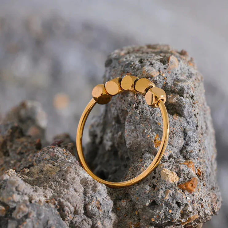 Dodajte svoji zbirki nakita kanček prefinjenosti z Prstan Madeline s kvadratnimi perlicami znamke Huna Jewelry. Ta minimalističen in moderen kos ima nežne premične kvadratne perlice, ki ponujajo sodoben, a brezčasen videz. Izdelan je iz visokokakovostnega nerjavečega jekla z 18-karatnim PVD zlatom, zato je odporen proti rji, vodoodporen in zasnovan za dolgotrajen sijaj. Zaradi tanke in zložljive zasnove je idealen za kombiniranje z drugimi prstani ali za samostojno nošenje za subtilen videz.