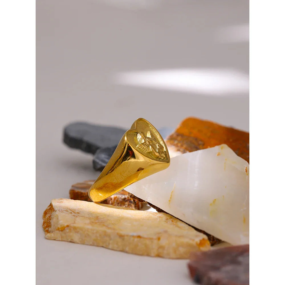 Sprejmite božansko eleganco s prstanom Miriam Angel Heart iz Huna Jewelry. Ta prstan z ravnim osrednjim delom v obliki srca in zapleteno reliefnim angelskim dizajnom izžareva romantičen čar in brezčasno lepoto. Izdelan je iz visokokakovostnega nerjavečega jekla z 18-karatnim zlatom, zato je vodoodporen, vzdržljiv in odporen proti oksidaciji, zaradi česar je popoln za vsakodnevno nošenje ali posebne priložnosti. Ta elegantni kos, simbol ljubezni in zaščite, je premišljeno darilo zase ali za ljubljeno osebo.