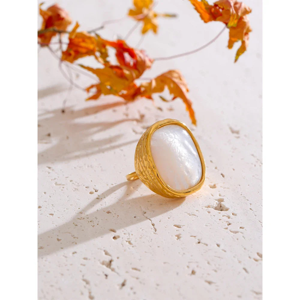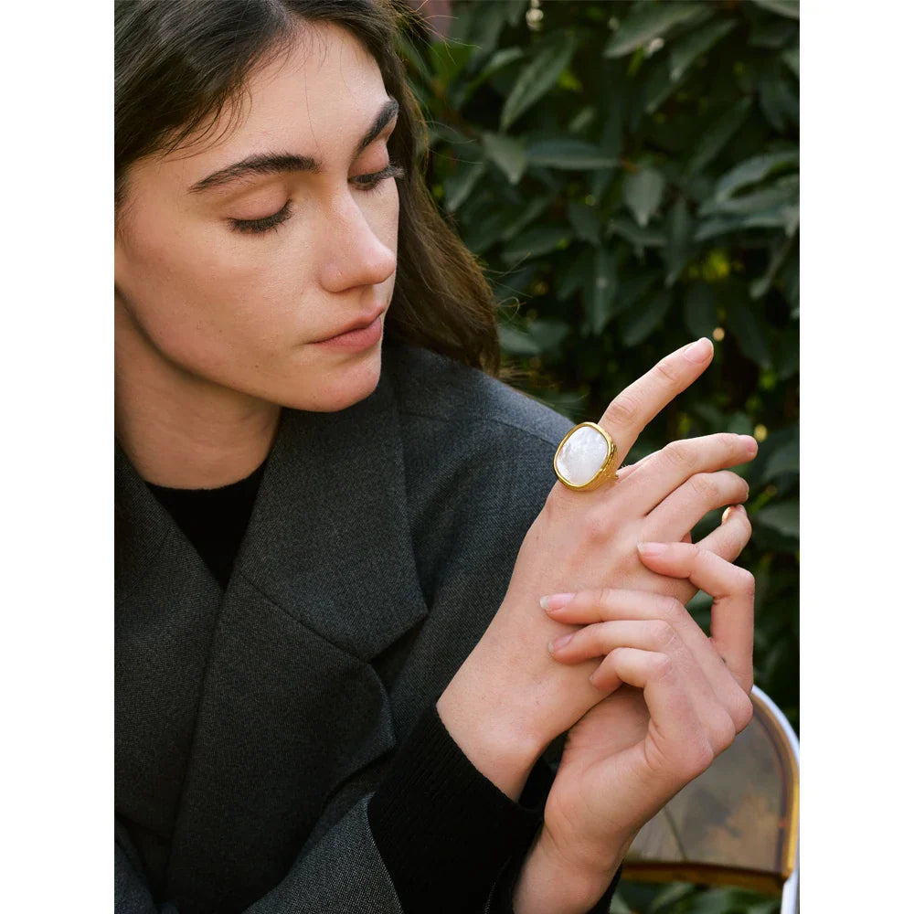 Nadgradite svojo zbirko nakita z nastavljivim prstanom Nori Square Shell znamke Huna Jewelry. Ta minimalističen, a drzen dizajn ima tanek obroč iz nerjavečega jekla, ki ga dopolnjuje debel, teksturiran kvadratni okvir, v katerega je vdelana naravna školjka. Kombinacija geometrijske natančnosti in organske lepote naredi ta kos nakita izstopajoč dodatek. Ta nastavljiv in vodoodporen prstan, izdelan iz vrhunskega nerjavečega jekla z 18-karatnim PVD zlatom, je popoln za vsakodnevno nošenje ali posebne priložnosti.