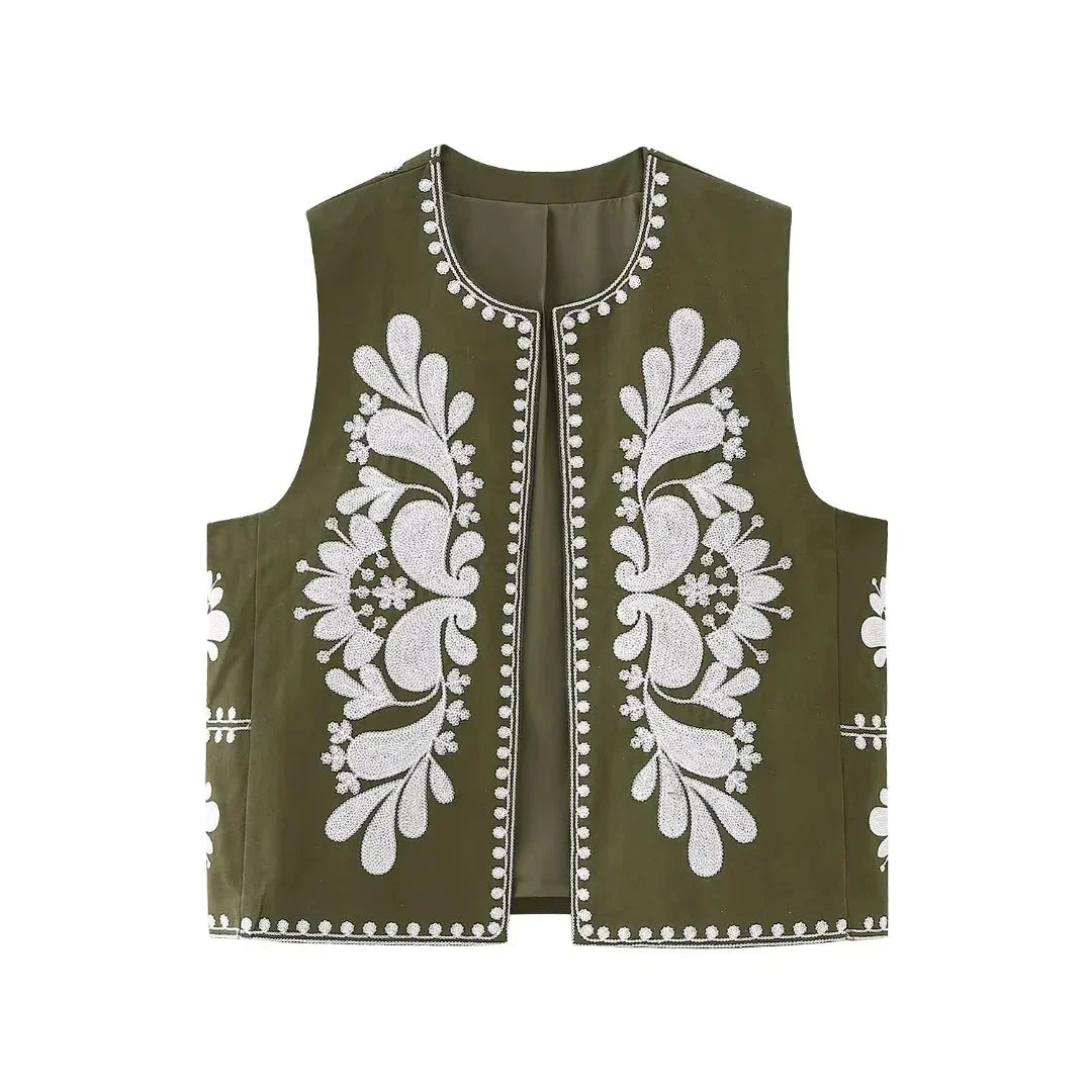 Preobrazite svojo garderobo s tem izvrstnim ženskim vezenim brezrokavnikom, okrašenim z zapletenimi cvetličnimi vzorci. Zasnovan je za lahkotno nošenje v plasteh, njegov kroj brez rokavov pa vam omogoča, da ga čudovito kombinirate z bluzami ali oblekami, kar poudari teksturo in eleganco vaše obleke. Ta vsestranski brezrokavnik združuje brezčasno vezenje s sodobno silhueto, zaradi česar je obvezen dodatek k vaši zbirki.