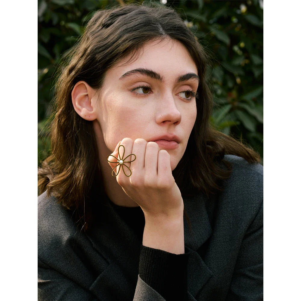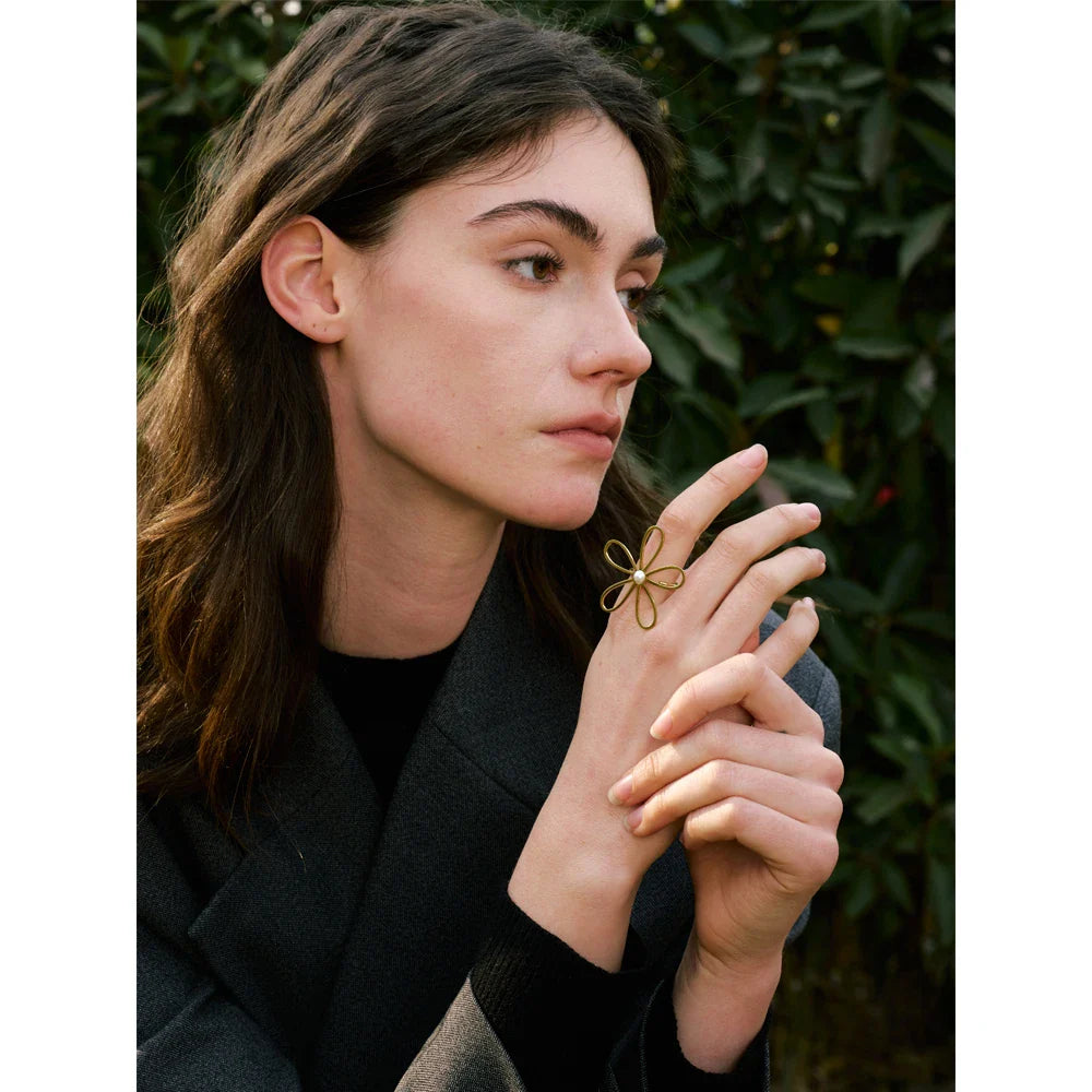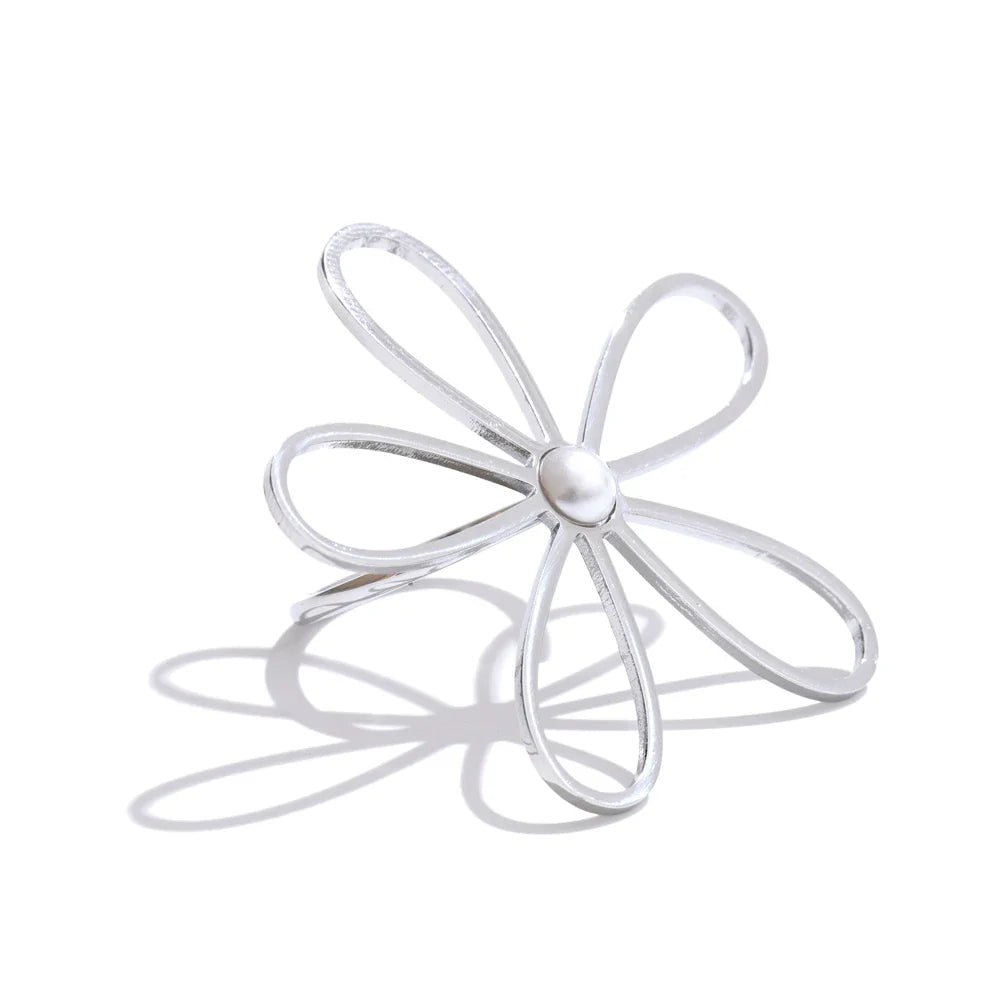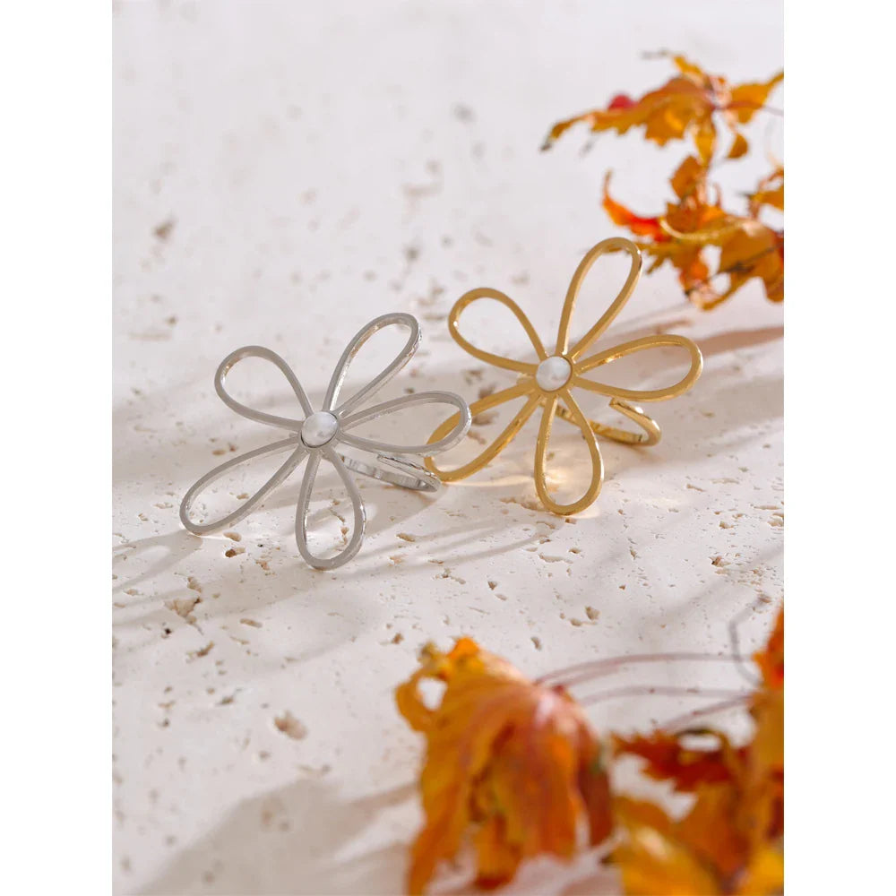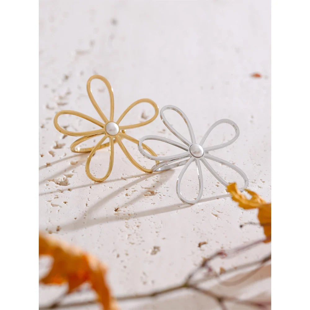 Prstan Seren Hollow Flower znamke Huna Jewelry je osupljiva mešanica elegance in drznega dizajna. Z nežnim odprtim obročkom z velikim, votlim cvetličnim motivom in mini bisernim poudarkom na sredini je ta prstan hkrati moderen in brezčasen. Izdelan je iz visokokakovostnega nerjavečega jekla s PVD zlatom, je vodoodporen, ne pušča sledi in je popoln za vsakodnevno nošenje. Ta nastavljiv, izstopajoč prstan je idealen za tiste, ki imajo radi nakit s cvetličnim navdihom in sodobnim pridihom.